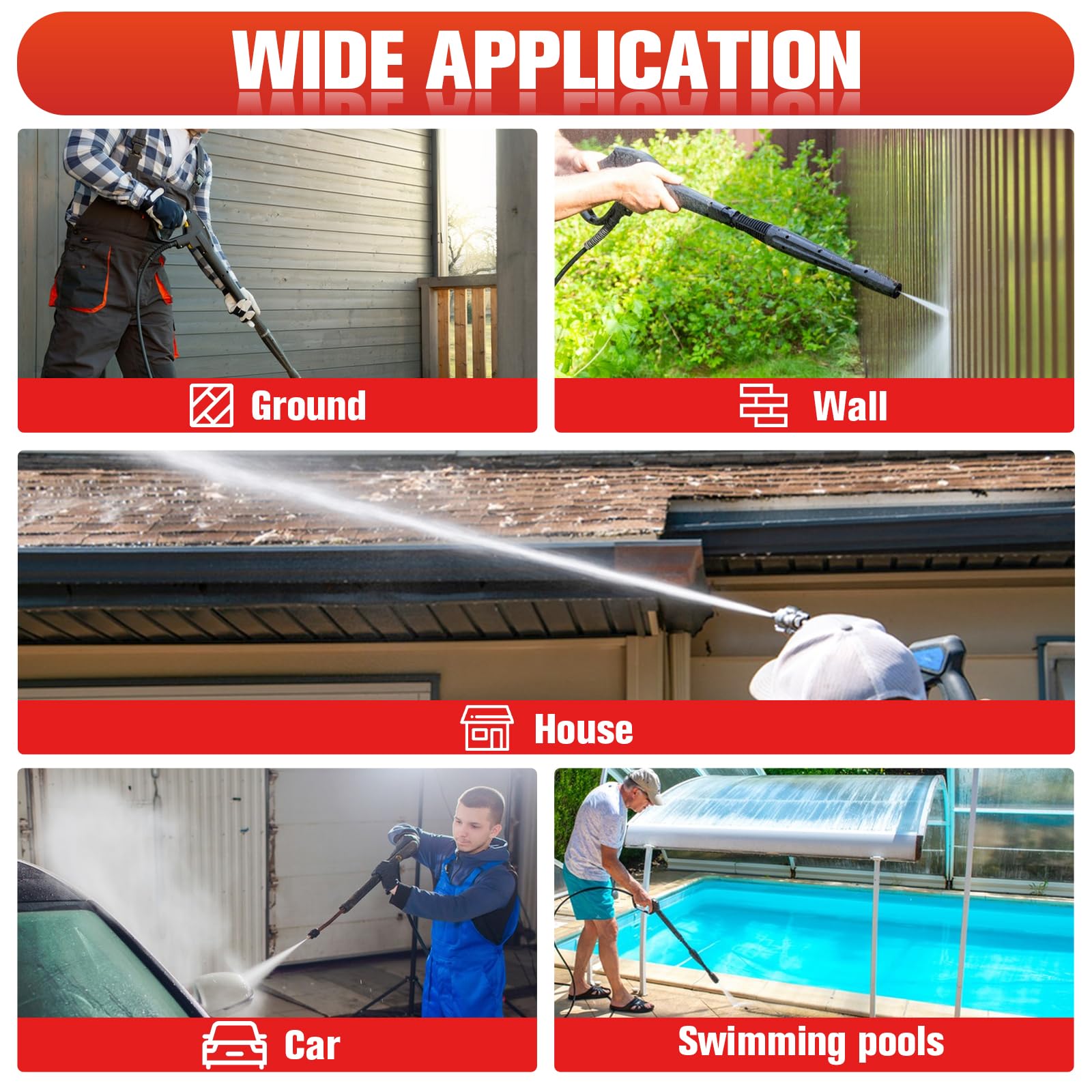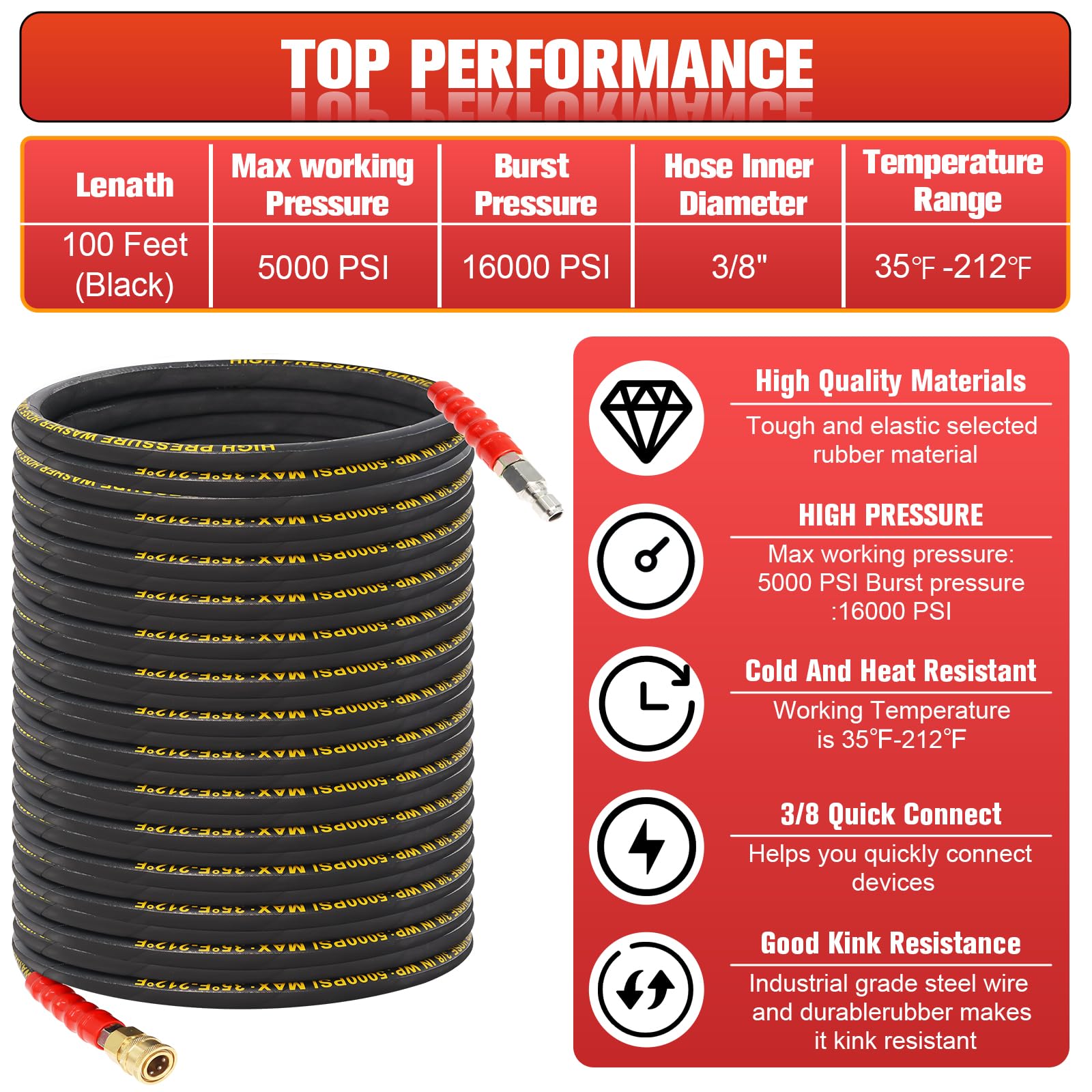 【Kink Resistant Power Washer Hose】: 100ft heavy-duty and durable high strength steel wire braided power washer hose, choose 3/8" ID, the inner tube is reinforced with synthetic rubber for better abrasion and weather resistance, and its innovative high-tech materials and processes can prolong the life of the hose. The new material prevents the hose from kinking during work and ensures a smooth, uninterrupted flow of water, helping you complete your cleaning tasks more easily and efficiently.