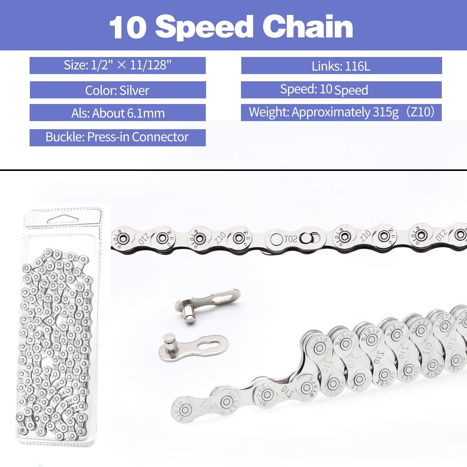 【Package Includes】- The kit includes 1 set 10 speed chain, 1pcs bike link plier with hook, 1pcs chain breaker and 6 pairs of bicycle chain buckle, they are efficient, accurate matching and labor-saving.
