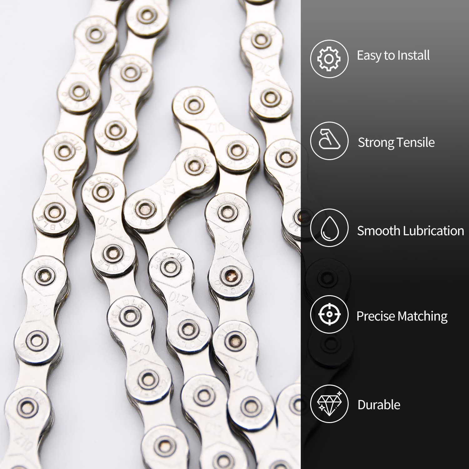 【High-quality Material】- Our bike chains are made of special forging steel which is repeated forged and strict controlled of materials to ensure the strength. The are full plating silver to anti-rust, high cost performance, anti-corrosion, wear-resistant and durable.