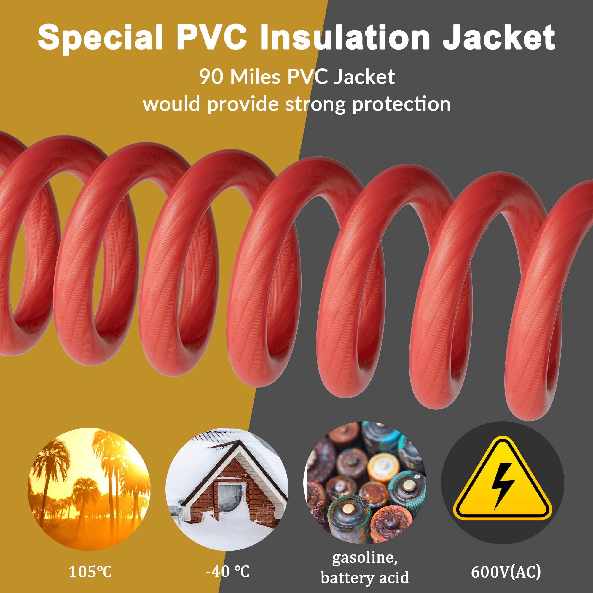 Soft-Touch PVC Jacket Maximizing Flexibility and Durability- HiFind true spec 4 gauge wires come with a rugged 90 Miles PVC jacket, offering both flexibility and durability for challenging placements, effectively preventing cable oxidation, corrosion, high temperature, gasoline, battery acid and abrasion. Its soft-touch design suits electrical and auto repair installations, providing indoor use versatility with built-in resilience to impacts and diverse conditions. Extreme Heat Tested.