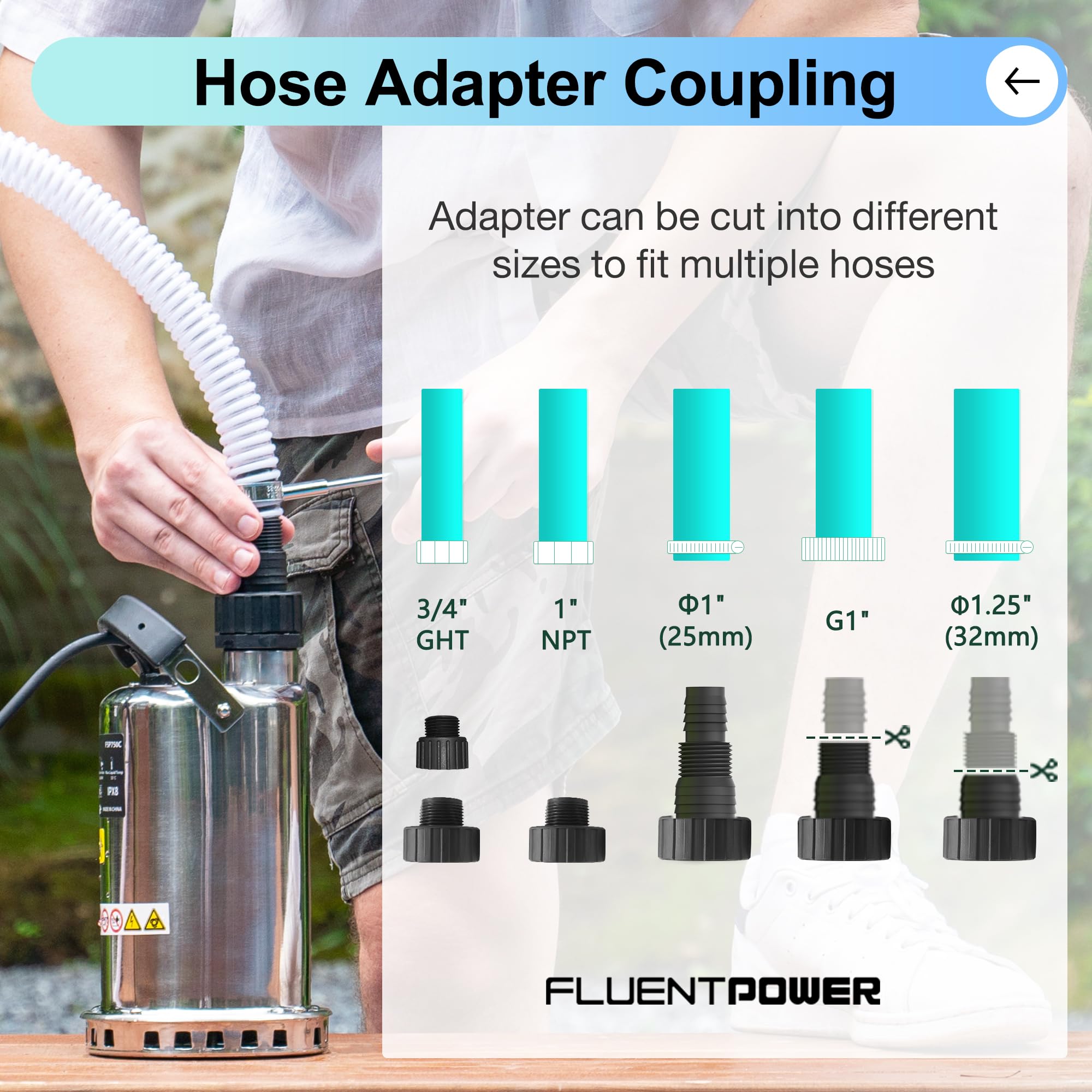 EASY TO INSTALL: Comes with three plastic adapters: GHT 3/4", NPT 1" and 1-1/2" male thread connectors. GHT 3/4"+NPT 1" connects standard garden hose for quick installation; 1-1/2" discharge port connects discharge hose for maximum output flow rate. Multiple hose adapters help you get the pump started much easier. It also has enough pressure to be connected with a sprayer for garden irrigation