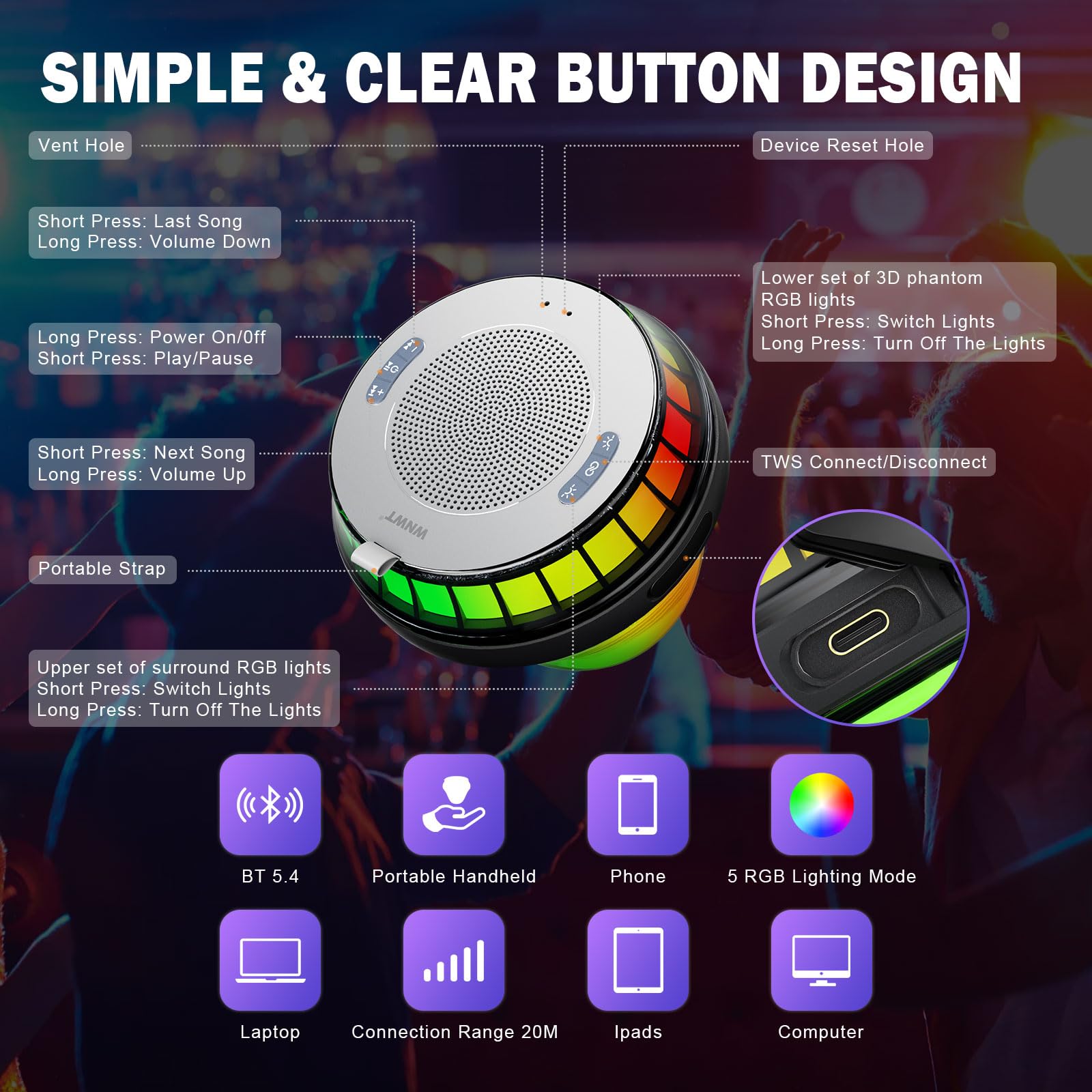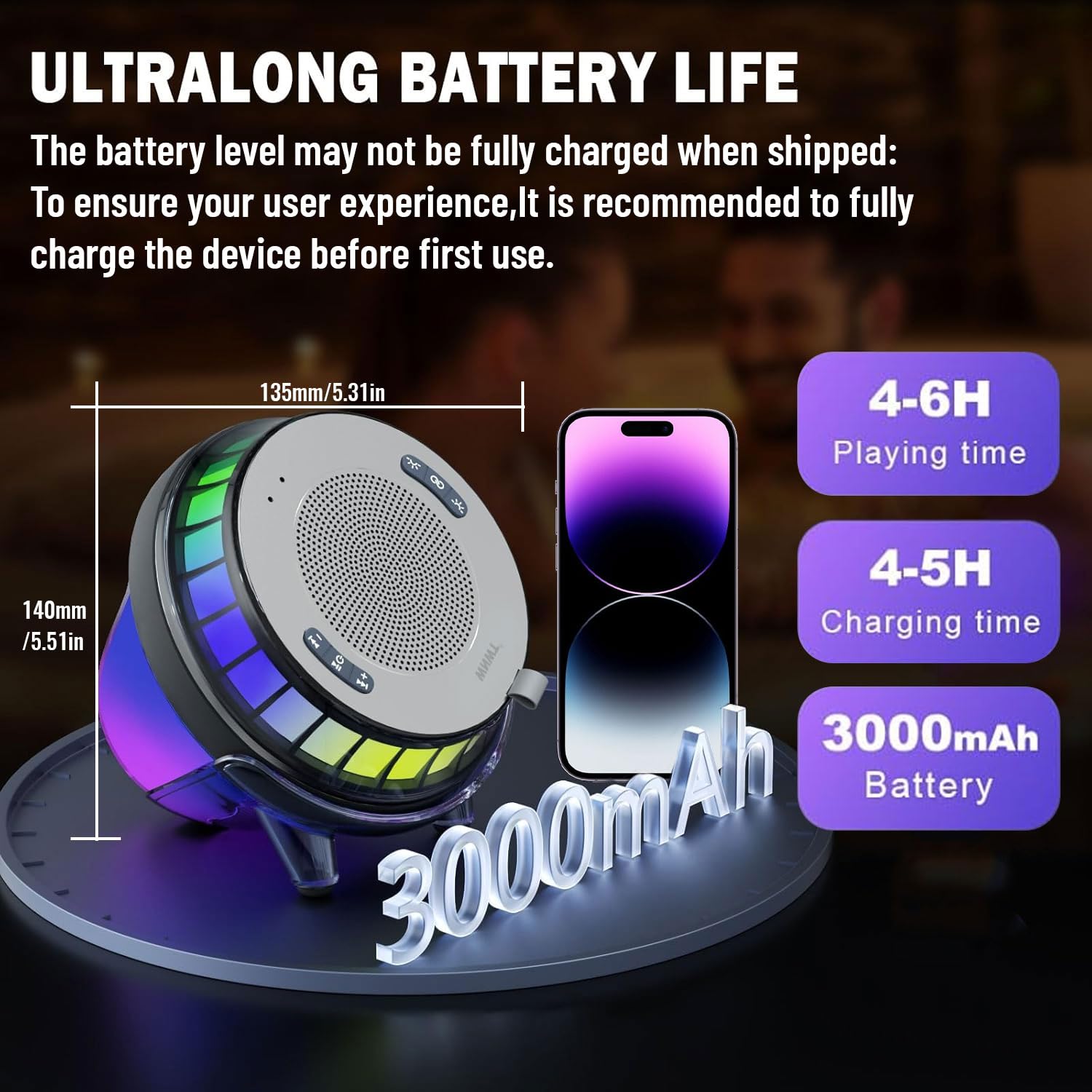 [Combination of Light & Sound] – The floating speaker for pool provides five vigorous lighting models to create atmospheres! Dynamic and static lighting provides mild, enchanting atmospheres; mild light colors and changes help you relax, and the flickering lights changing with music beats can enhance your overall experience. With 360° stereo, the hot tub lights makes each note clear, appealing, full of sense of depth