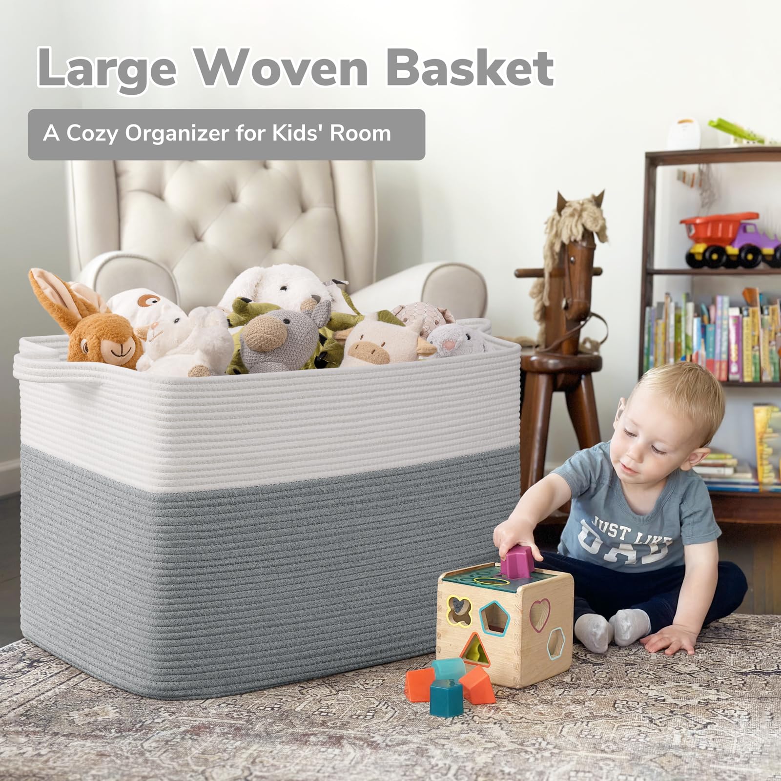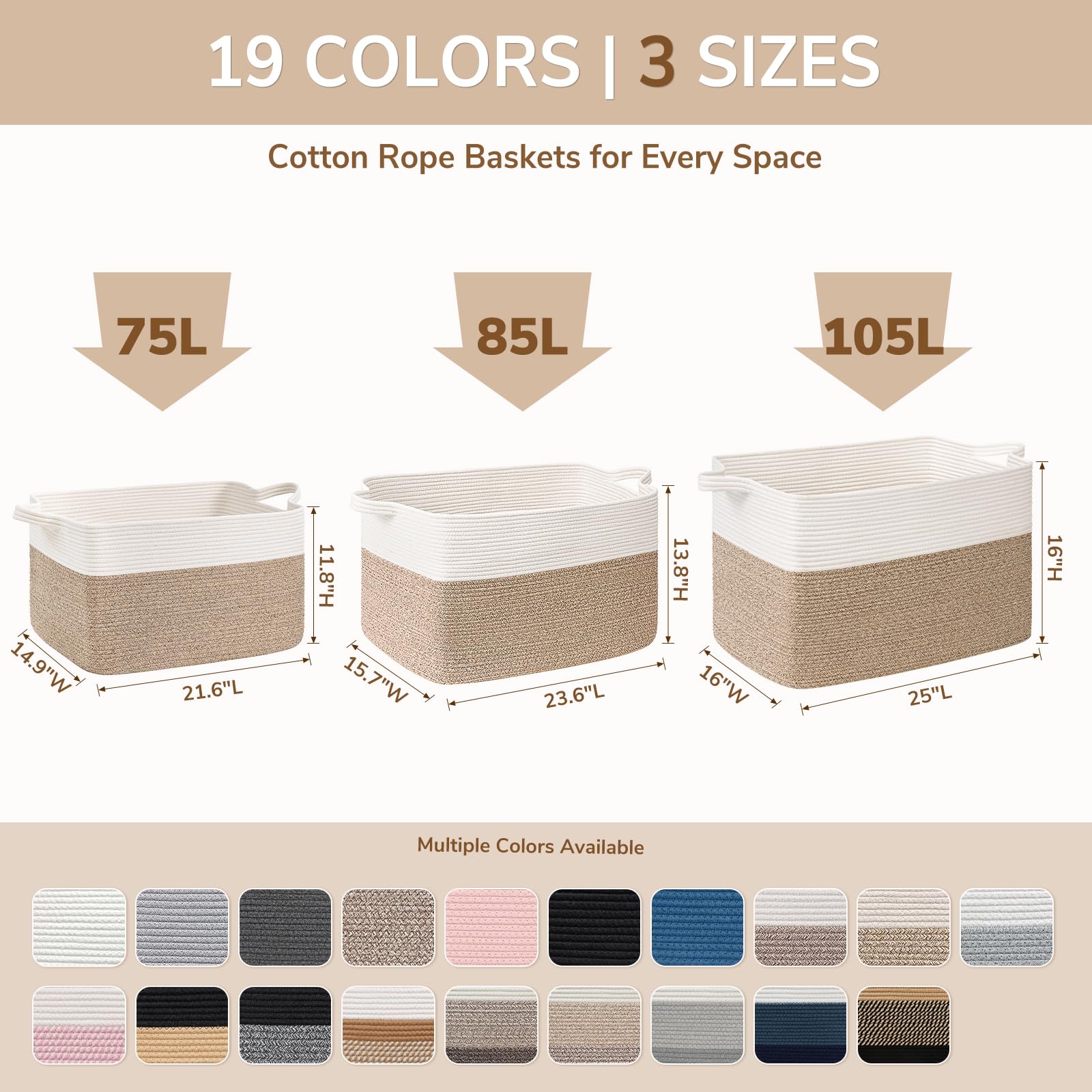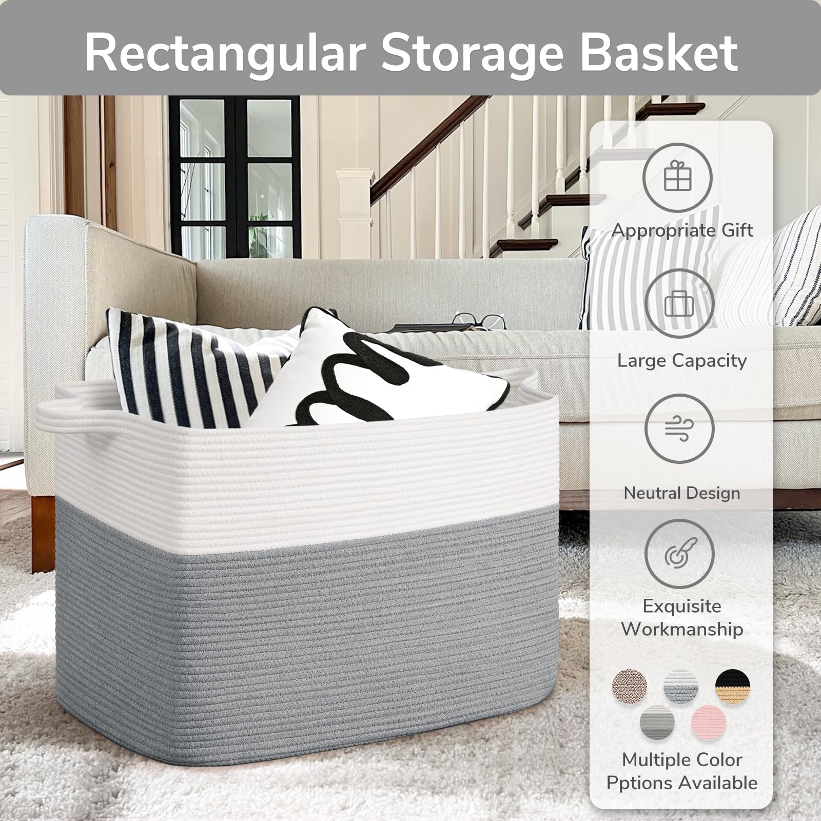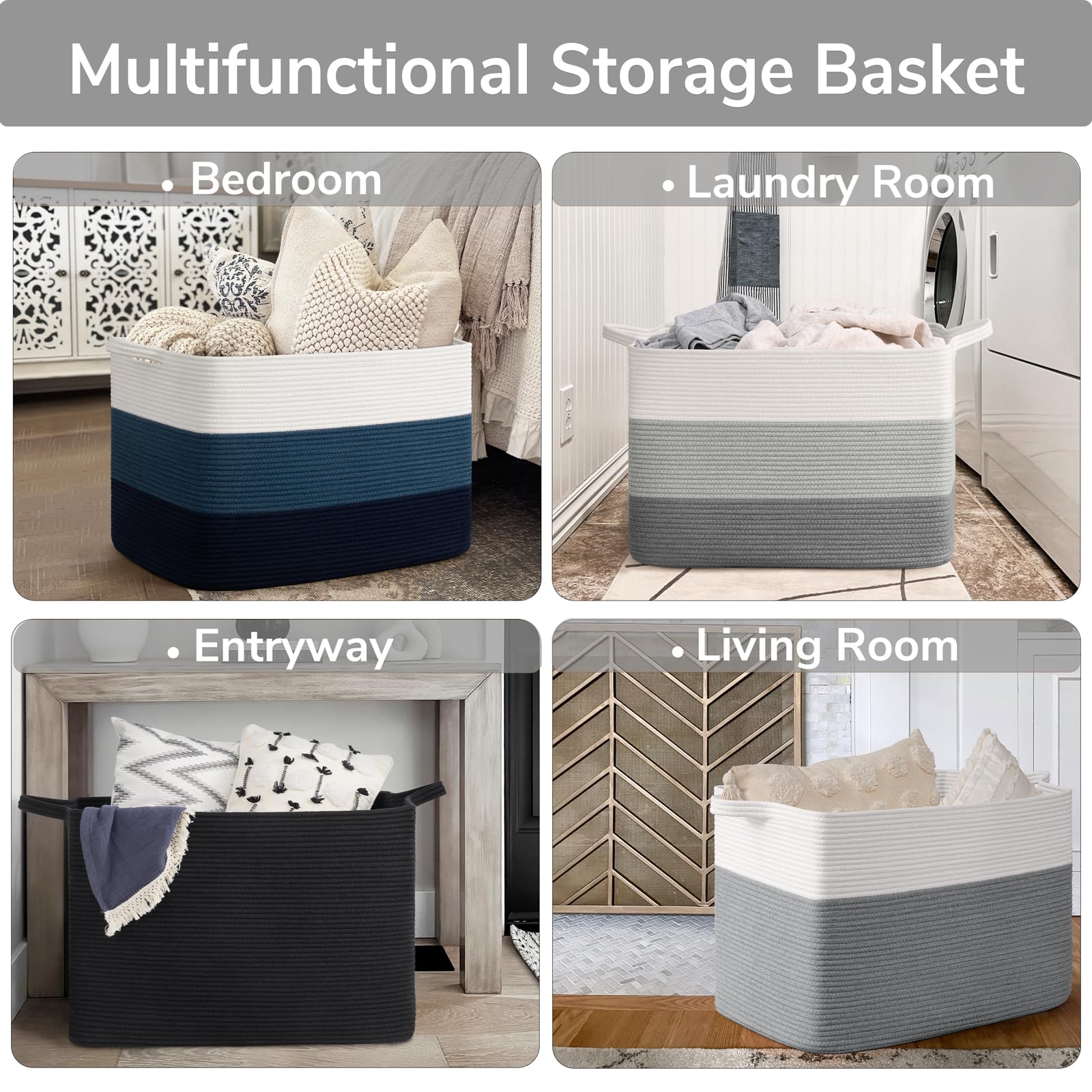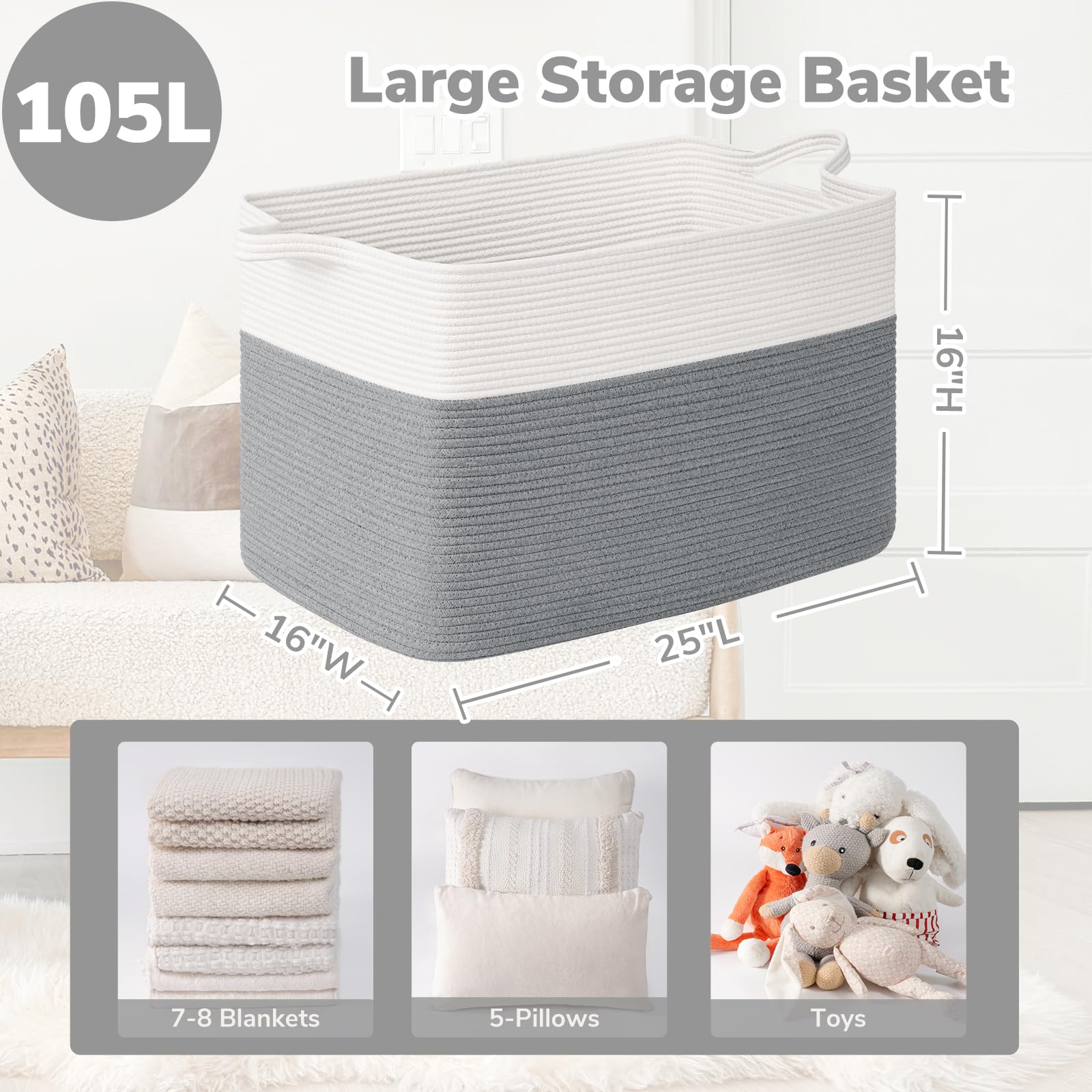 Large Capacity: 25"L x 16"W x 16"H, this large rectangle basket with 105L capacity is perfect for storing throw blankets, pillow, cushions, clothes, towels and stuffed animals