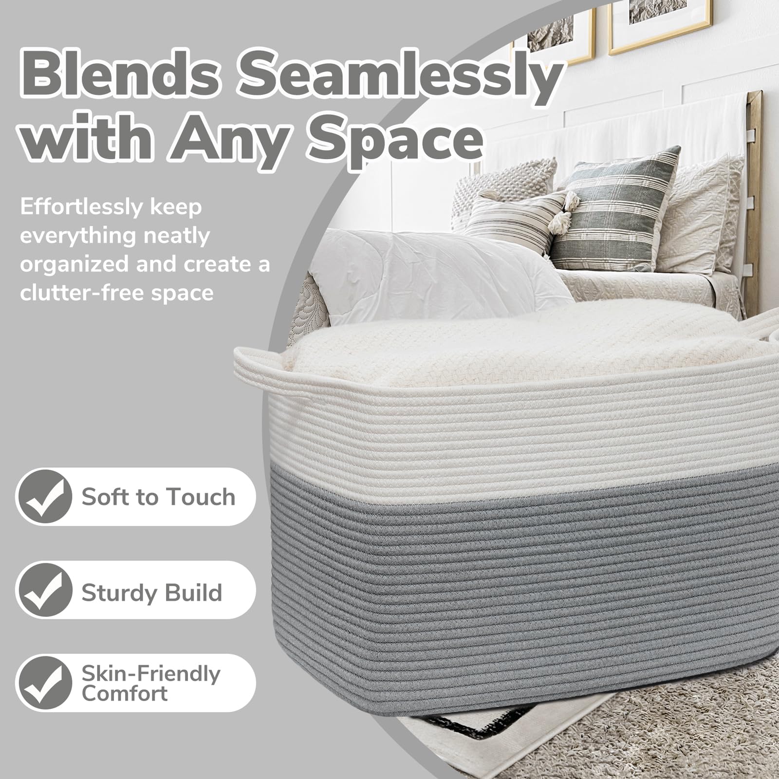 Soft Material: The woven basket is made of cotton rope, which is soft yet holds its shape well. No need to worry about scratching clothes or hurting skin, suitable for families with babies or pets