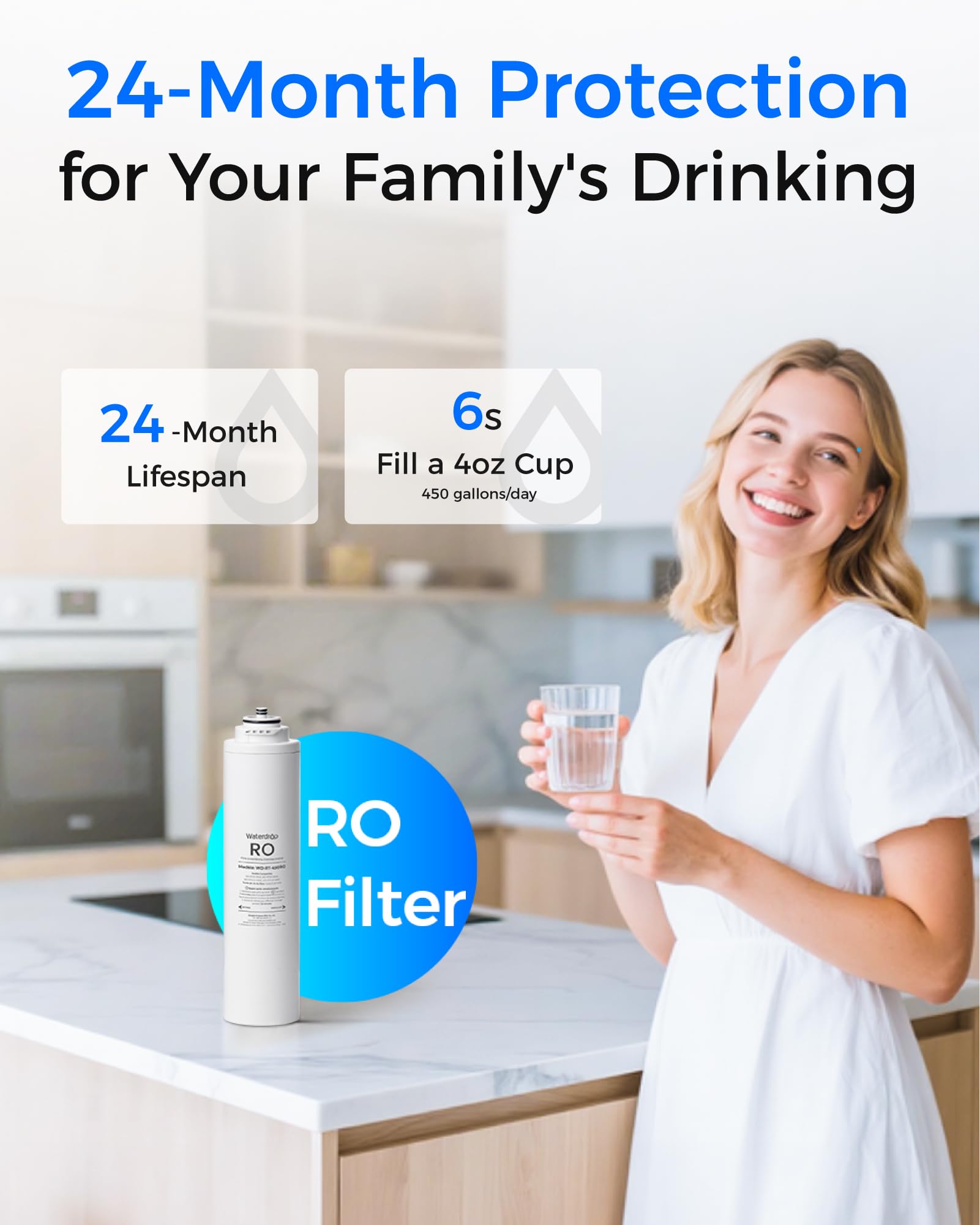 𝐋𝐨𝐧𝐠 𝐋𝐢𝐟𝐞𝐬𝐩𝐚𝐧 & 𝐇𝐢𝐠𝐡 𝐂𝐚𝐩𝐚𝐜𝐢𝐭𝐲: This bundle filters up to 1,056 gallons of purified water, equivalent to approximately 8,000 16.9oz plastic bottled water. This bundle includes two 6-month CF filters, one 12-month CBM filter, and one 24-month RO filter, ensuring a full year of pure, fresh water without frequent replacements. *Actual filter lifespan may vary based on local water quality and usage.