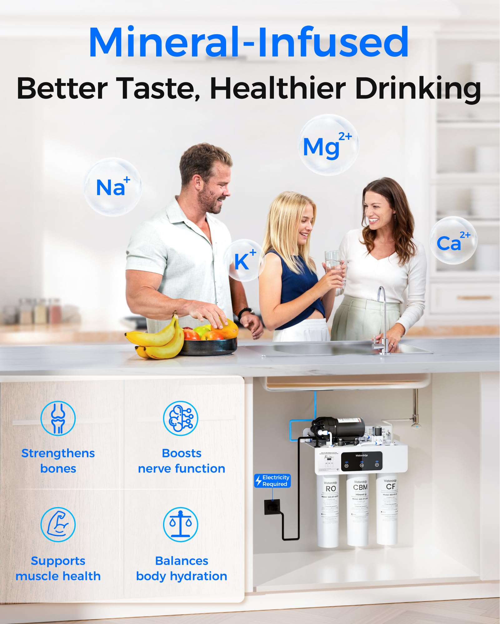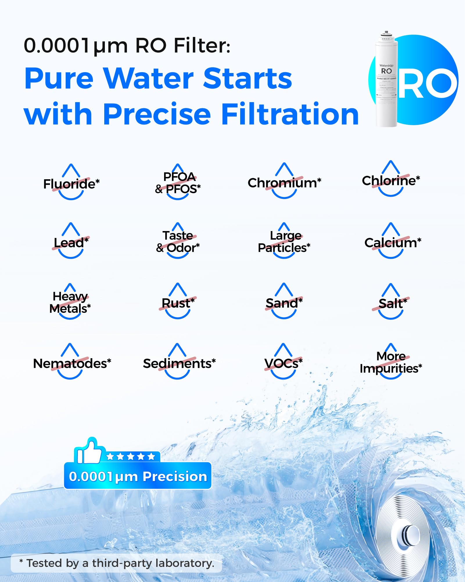 𝐀𝐝𝐯𝐚𝐧𝐜𝐞𝐝 𝐅𝐢𝐥𝐭𝐫𝐚𝐭𝐢𝐨𝐧 𝐰𝐢𝐭𝐡 𝐌𝐢𝐧𝐞𝐫𝐚𝐥 𝐄𝐧𝐡𝐚𝐧𝐜𝐞𝐦𝐞𝐧𝐭: This water filtration system combines a 2-5μm carbon filter, a 1-3μm mineralized carbon block, and a 0.0001μm RO filter to reduce contaminants such as colloids, sand, rust, chlorine, odor, fluoride, PFOA & PFOS, VOCs, and other impurities, providing cleaner and safer water. The mineralized carbon block infuses the water with Na⁺, Mg²⁺, K⁺, and Ca²⁺ to support bone strength, nerve function, and muscle health. *Tested by a third-party laboratory.