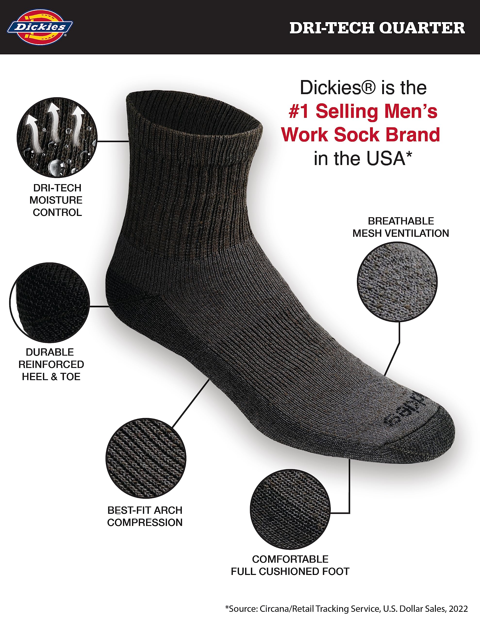 Description Dickies Men's Dri-tech Moisture Control Quarter Socks Multipack with wicking, moisture management fibers keeps feet dry, ventilation channels engineered for air circulation and moisture control, arch compression hugs feet and keeps socks in place, while providing in-step support, Reciprocated heel and toe for superior fit and full cushion comfort. For Over 95 Years Dickies has been making hard-duty work products built to stand up to whatever life throws at you. Dickies Work Socks are built with purpose to deliver superior comfort and performance on and off the job.
