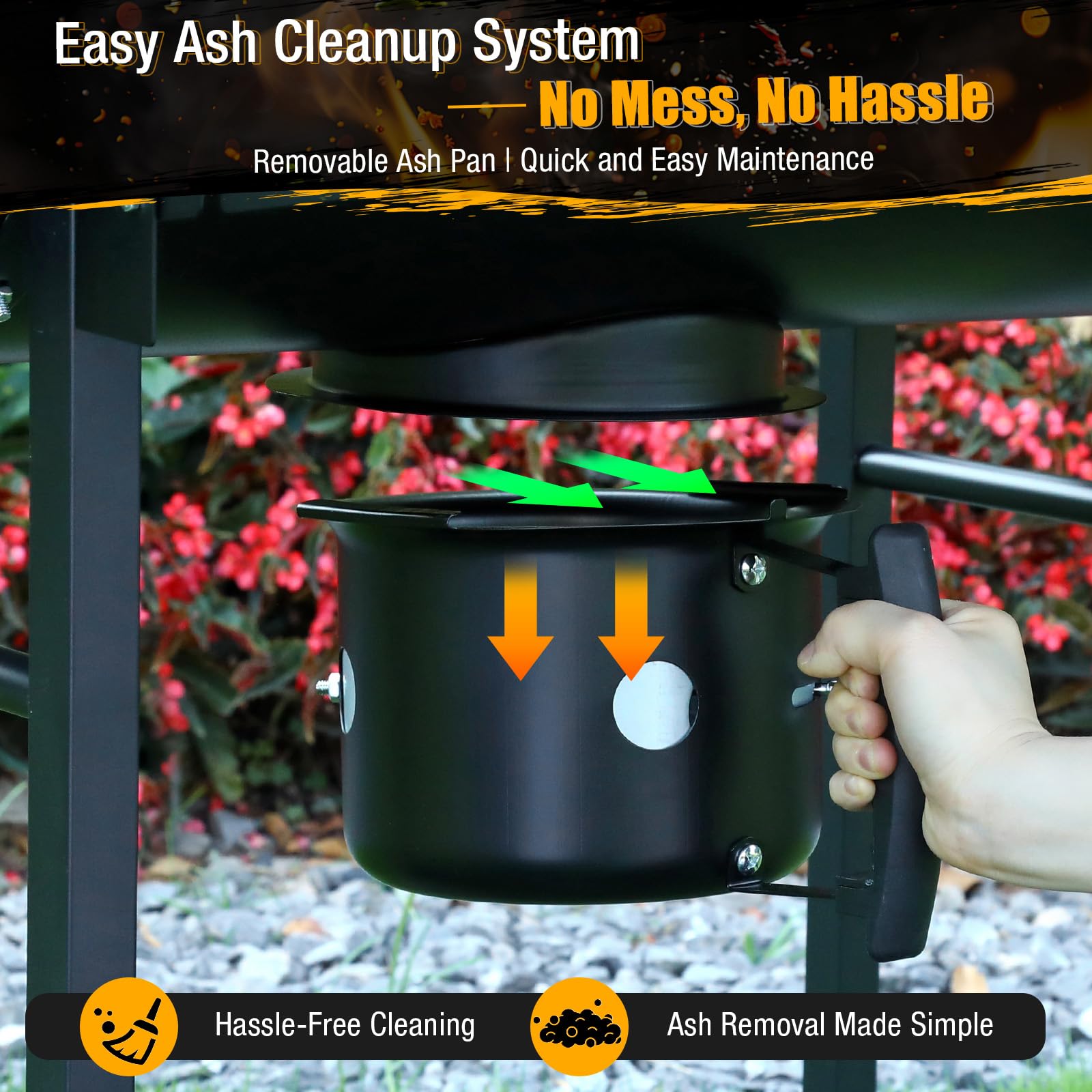 Convenient Charcoal Refueling & Ash Management: The center-lift charcoal access grate lets you add coal without removing the whole rack - no interruptions while grilling. Combined with an easy-clean ash holder, this coal grill keeps your cookout flowing smoothly and cleaning hassle-free