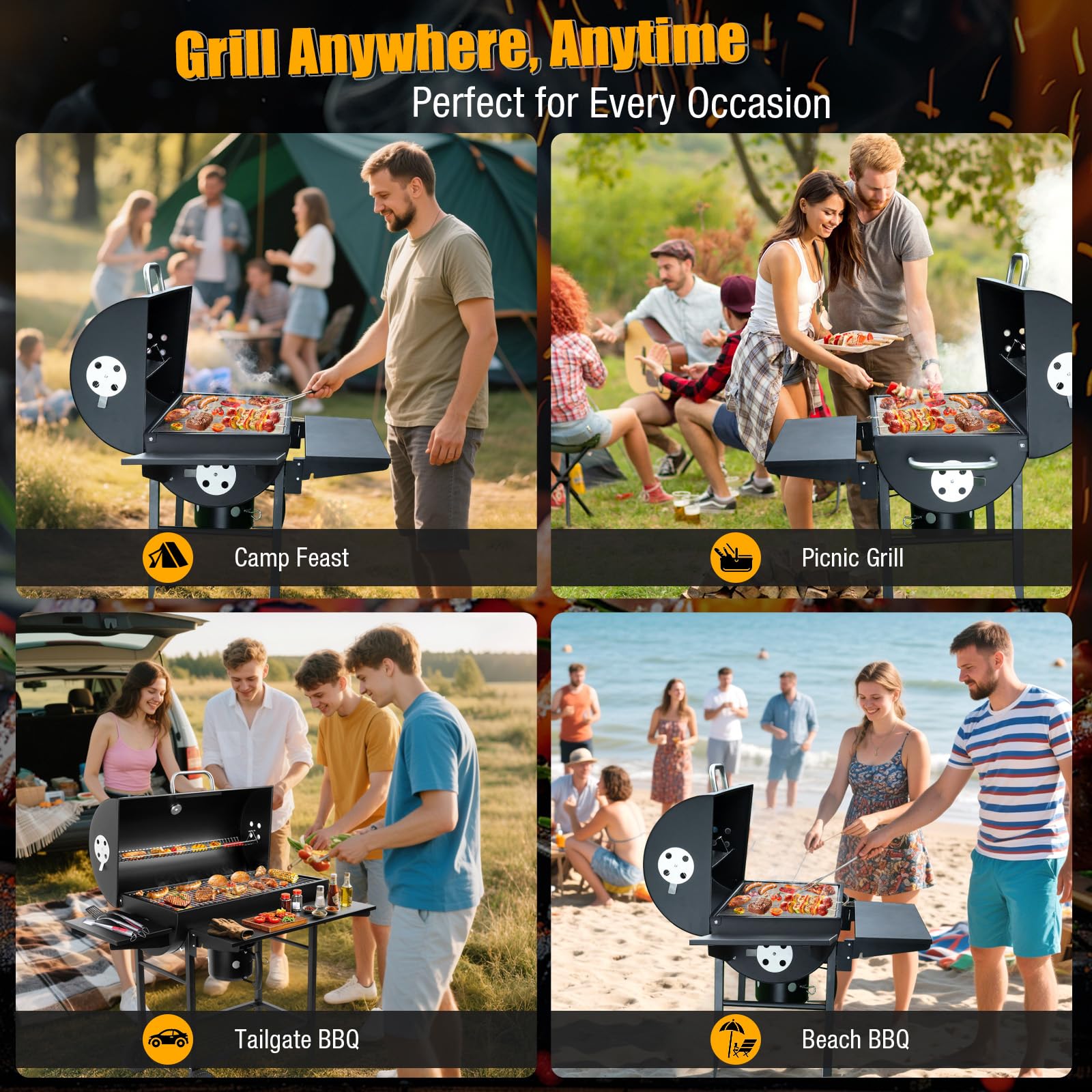 Expansive Cooking Surface: With 589.32 sq. in. total cooking space, our charcoal bbq grill is ideal for 5–6 BBQ lovers. The main cooking grill includes a convenient lift-up grate for easy coal refills, while the warming rack keeps food hot. This backyard grill makes your outside grills outdoor cooking smooth and satisfying