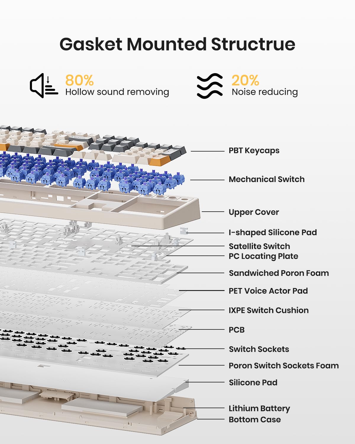 【Reunited with Kisnt’s Creamy】Designed with your comfort in mind, this gasket keyboard absorbing sound effectively. Enhanced with a silicone plate and base dampener, five layers of sound-dampening foam, the keys are just the right combination of clicky and clacky, even the space bar and other larger keys without being overly loud or hollow! It's the kind of sound that makes people around you comment " how nice it is "and generates interest in mechs, instead of "what‘s wrong with your keyboard?"