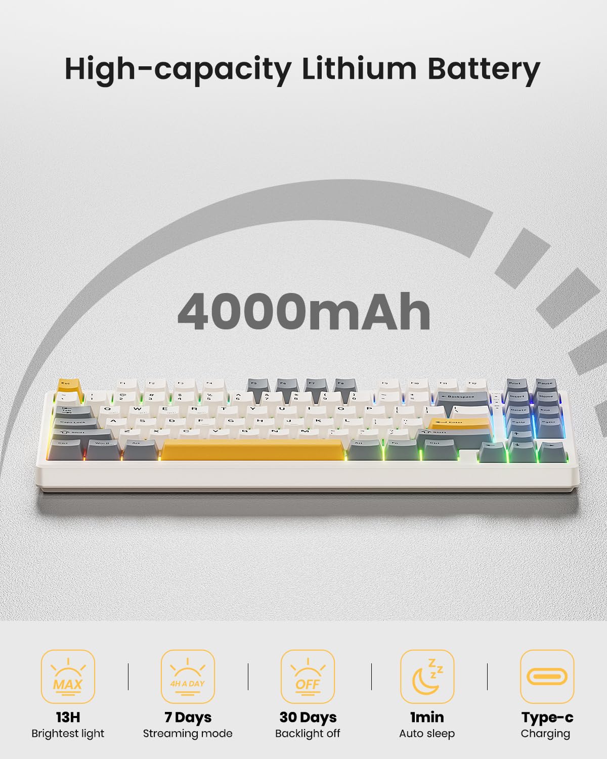 【Wireless Connectivity with Limitless Compatibility】 The gaming keyboard works the way you'd expect for wired (USB-C, also used for charging), 2.4G with a dongle (stored in bottom slot when not in use), Bluetooth (3 devices supported, like most BT keyboards). By offering all three modes of connection, allows you to switch between convenience and stability depending on your needs. The 4000mAh rechargeable battery life lasts for days on a full charge, so you won’t need to worry about constantly re