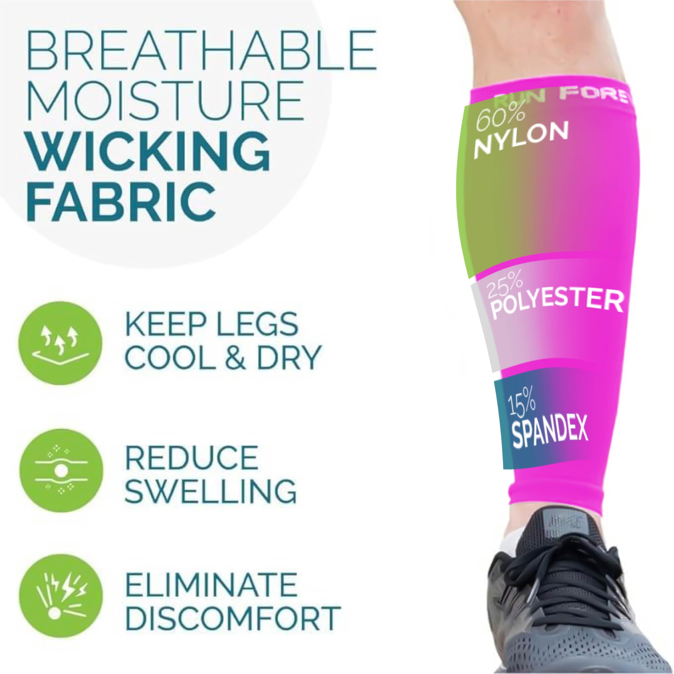 High quality: The leg compression sleeve is made of premium fabric with a combination of 60% Nylon, 25% Polyester & 15% Spandex making it durable, machine washable, breathable & comfortable