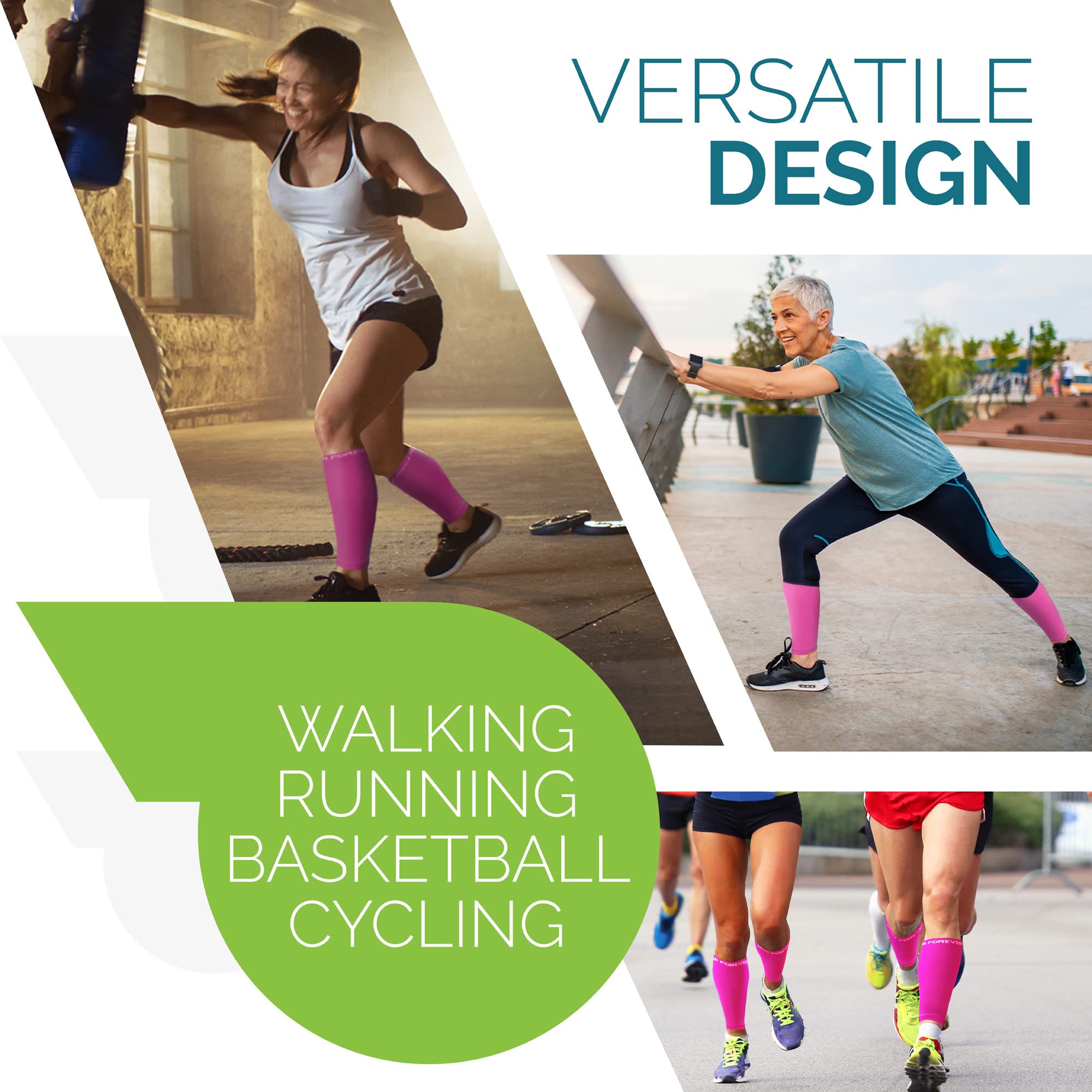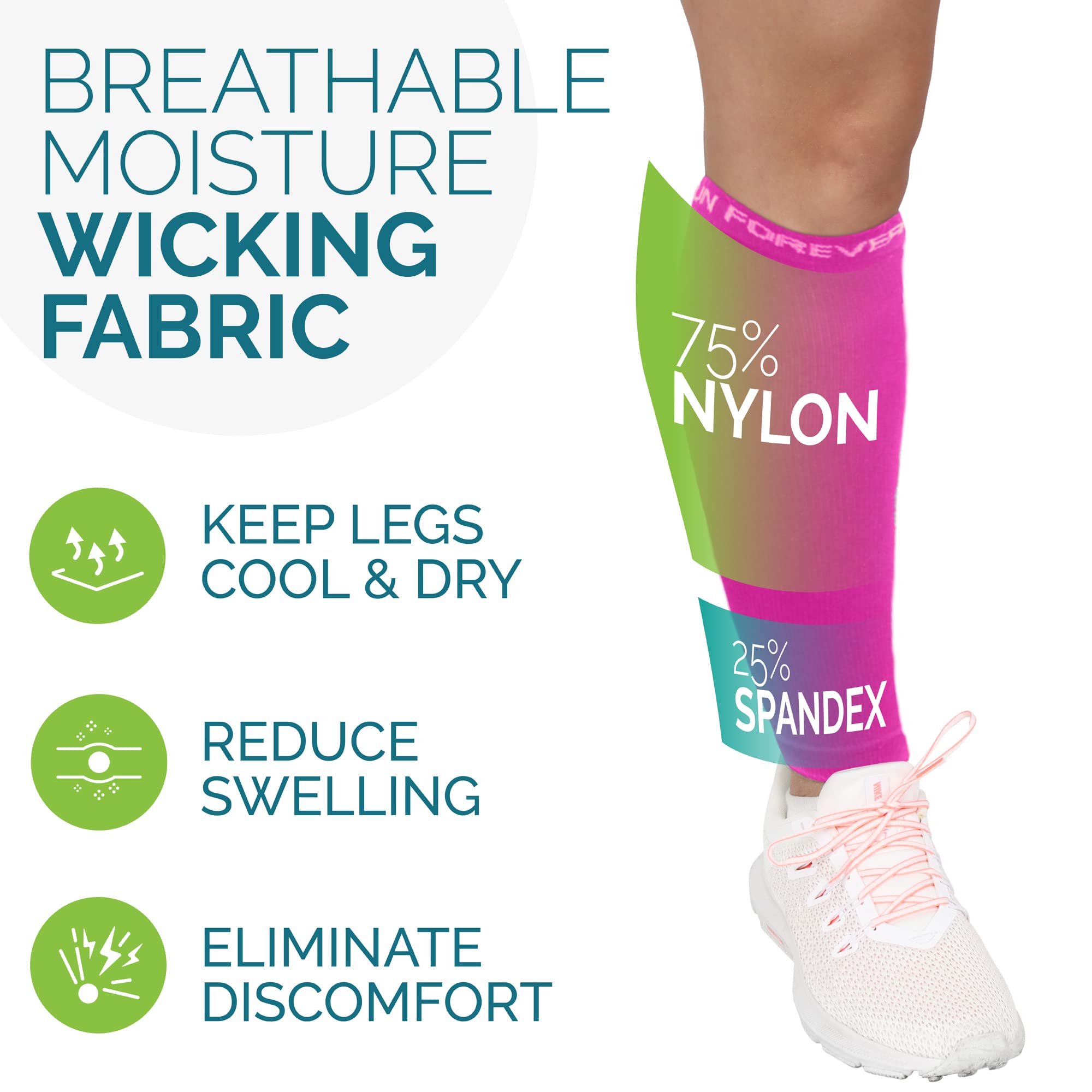 Multiple designs, colors & sizes: Run Forever Sports calf compression sleeve for men & women has many engaging colors and caters to all sizes, from small, to xl, to plus size!