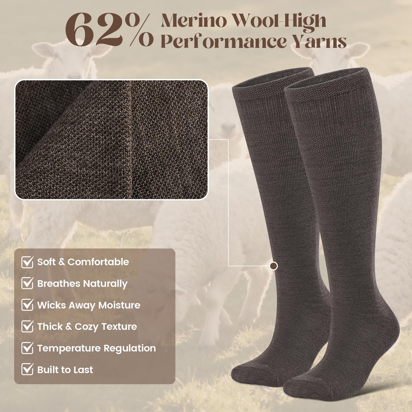62% Merino wool high-performance fabric: Makes these thick compression socks softer and more breathable, helping regulate temperature to keep your feet warm and comfortable—ideal compression socks for men and women during daily wear
