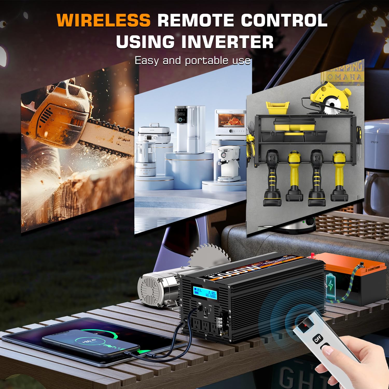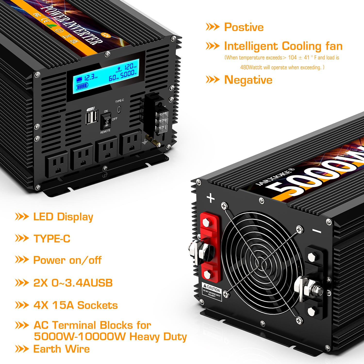 ☀ This is a 12 volt 5000 watt modified wave inverter DC 12v to AC 110V/120V. Perfect for traveling, camping, tents, boat trips, working on the road, and anywhere without electricity! Just connect the power inverter to the battery and then to the device.