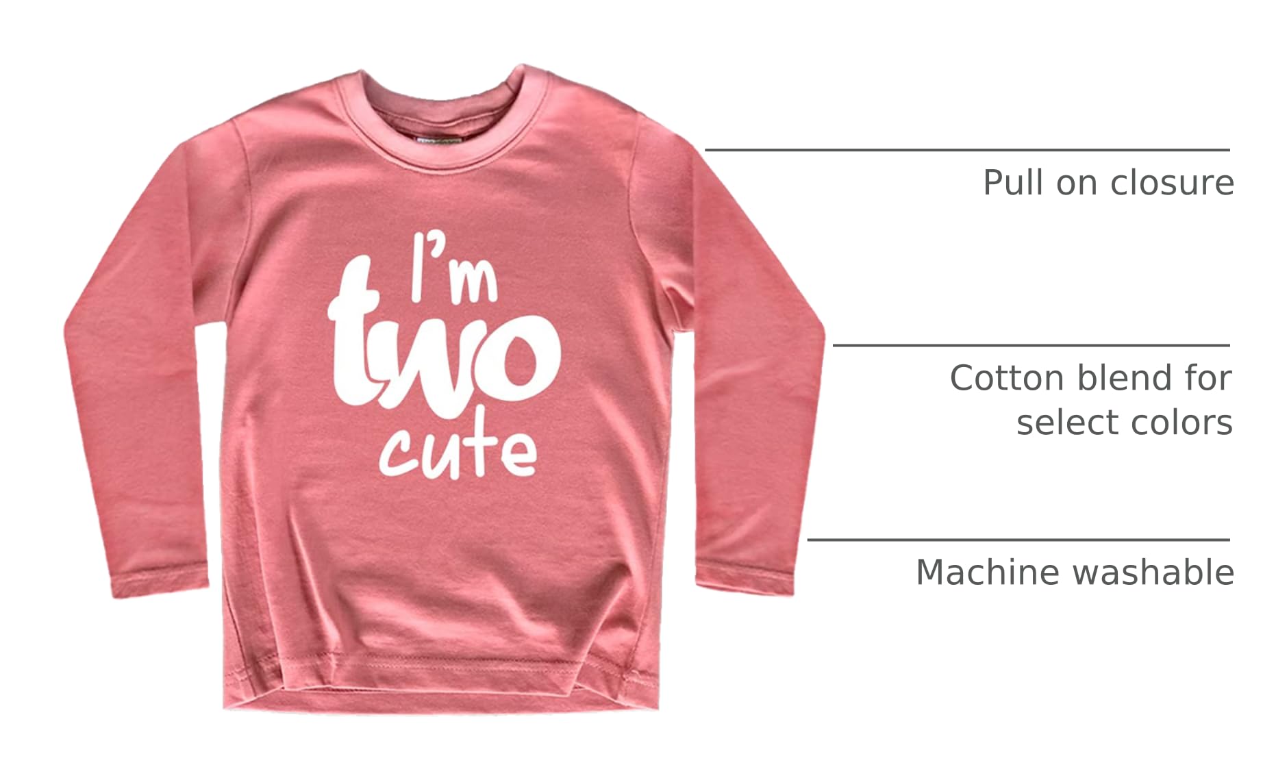 The second birthday outfit girl shirt in Mauve is made from 100 Percent Cotton material. All of our products are machine washable.