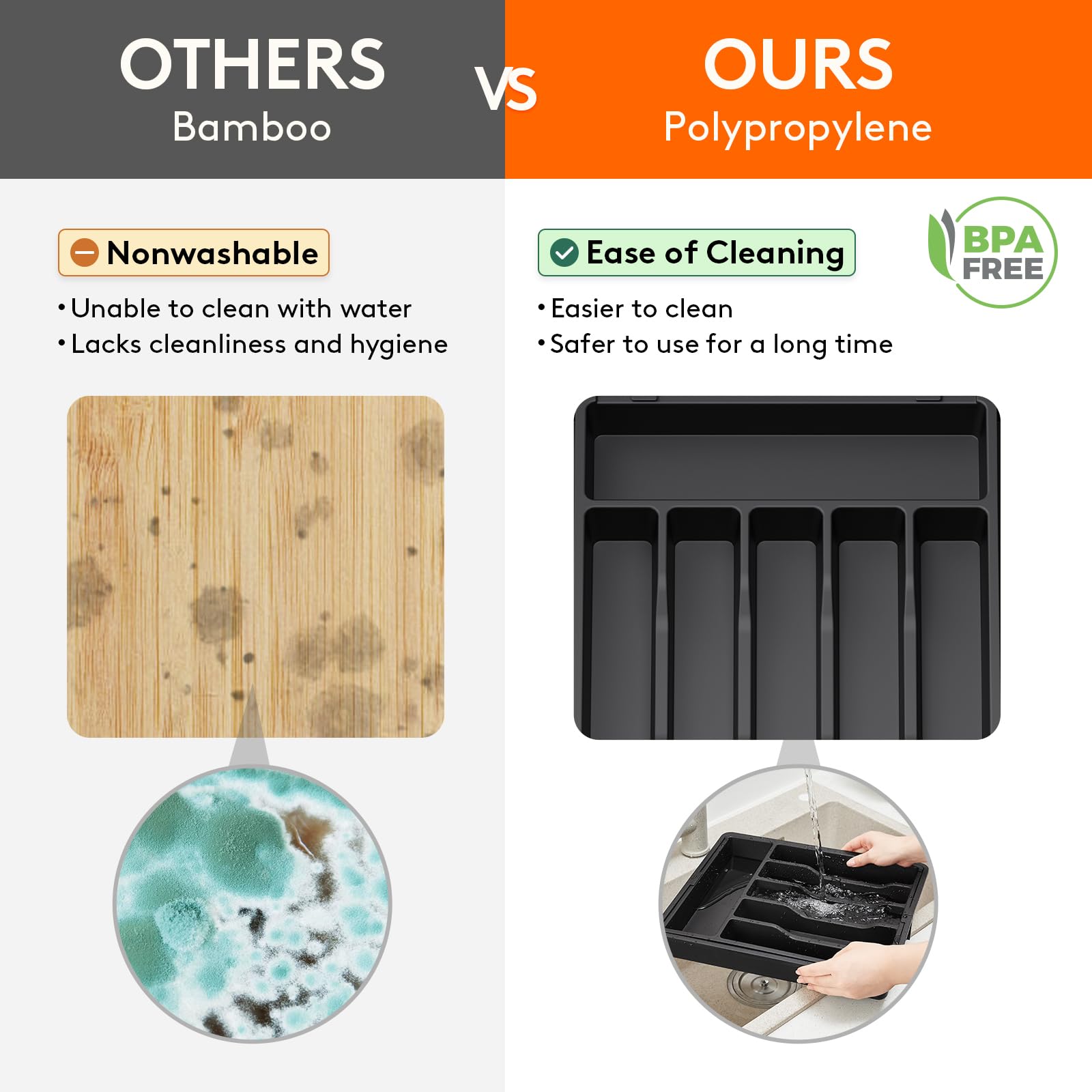 Robust and Safe: This kitchen drawer organizer is crafted from premium PP material, BPA-free and designed for reliable use. It keeps your silverware in a clean and safe environment