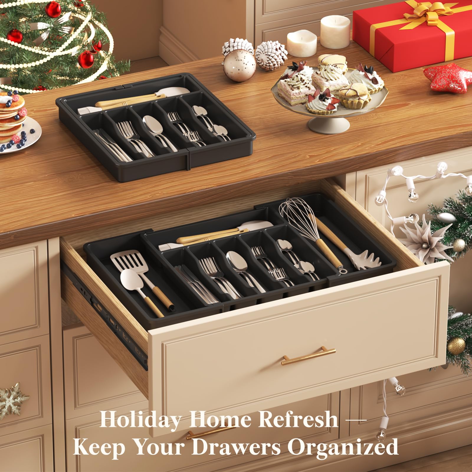 Adjustable Design: With its retractable design, The Lifewit silverware organizer fits drawers of various sizes and shapes. It measures 13'' wide when folded while reaching 22.4'' when fully expanded. This universal utensil drawer organizer helps you maximize storage space efficiently while keeping your utensils neatly organized and easily accessible