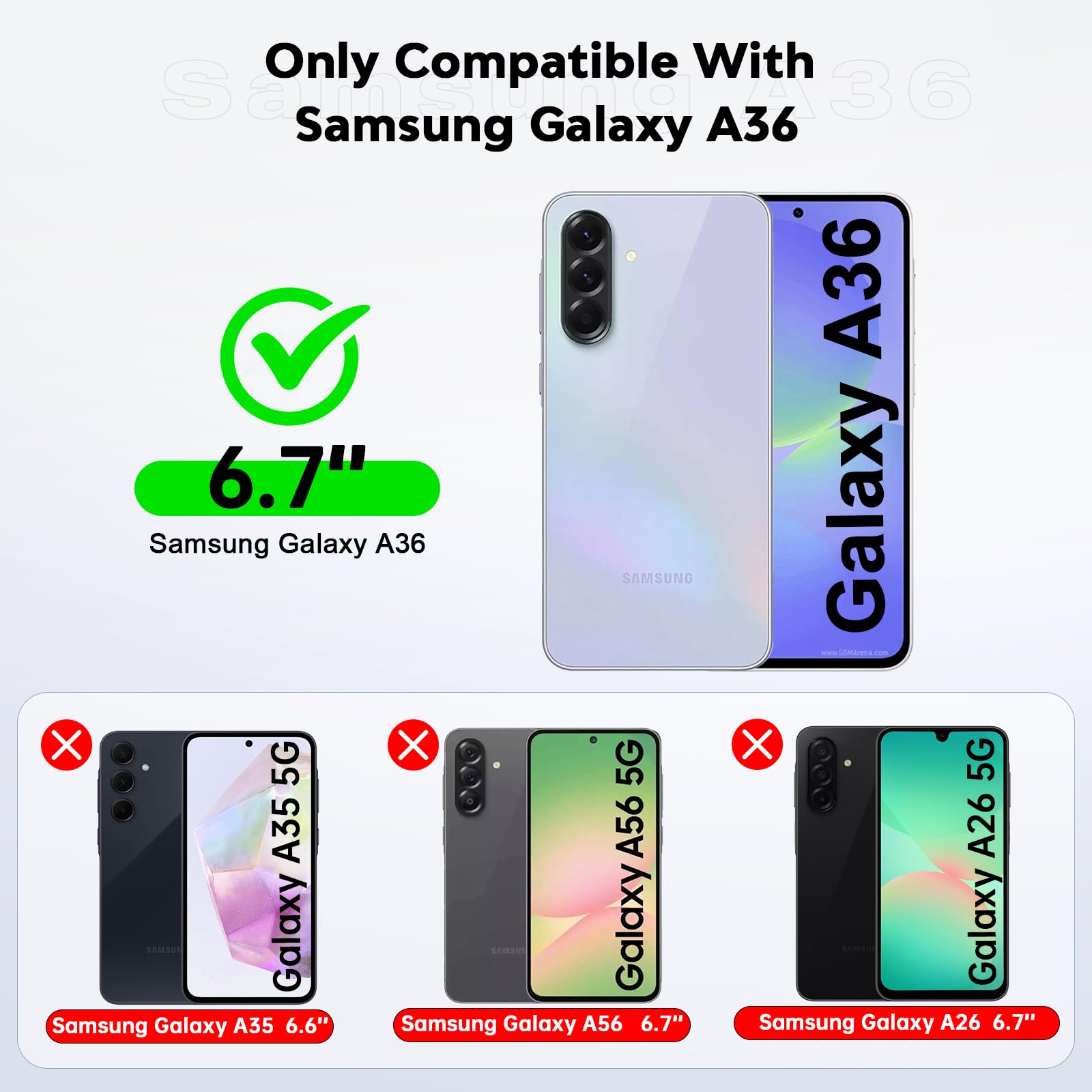 Compatibility: Samsung Galaxy A36 5G Case cares for every detail with precise cutouts allow easy access to all ports, speakers, cameras, buttons, and other functions. Won't compatible with any other phone models. Notice: Due to the metal ring on the back, the case will 𝗡𝗢𝗧 𝘄𝗼𝗿𝗸 𝘄𝗶𝘁𝗵 𝗪𝗶𝗿𝗲𝗹𝗲𝘀𝘀 𝗖𝗵𝗮𝗿𝗴𝗶𝗻𝗴 𝗙𝘂𝗻𝗰𝘁𝗶𝗼𝗻