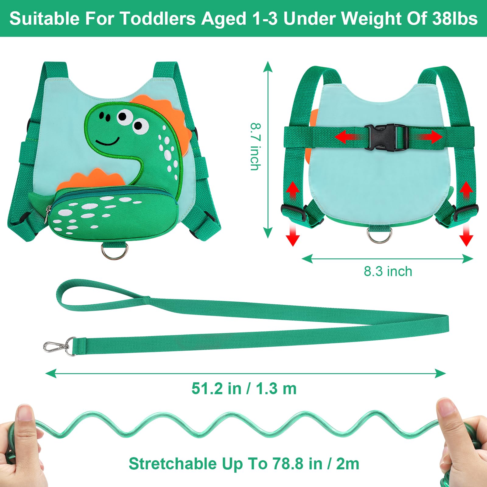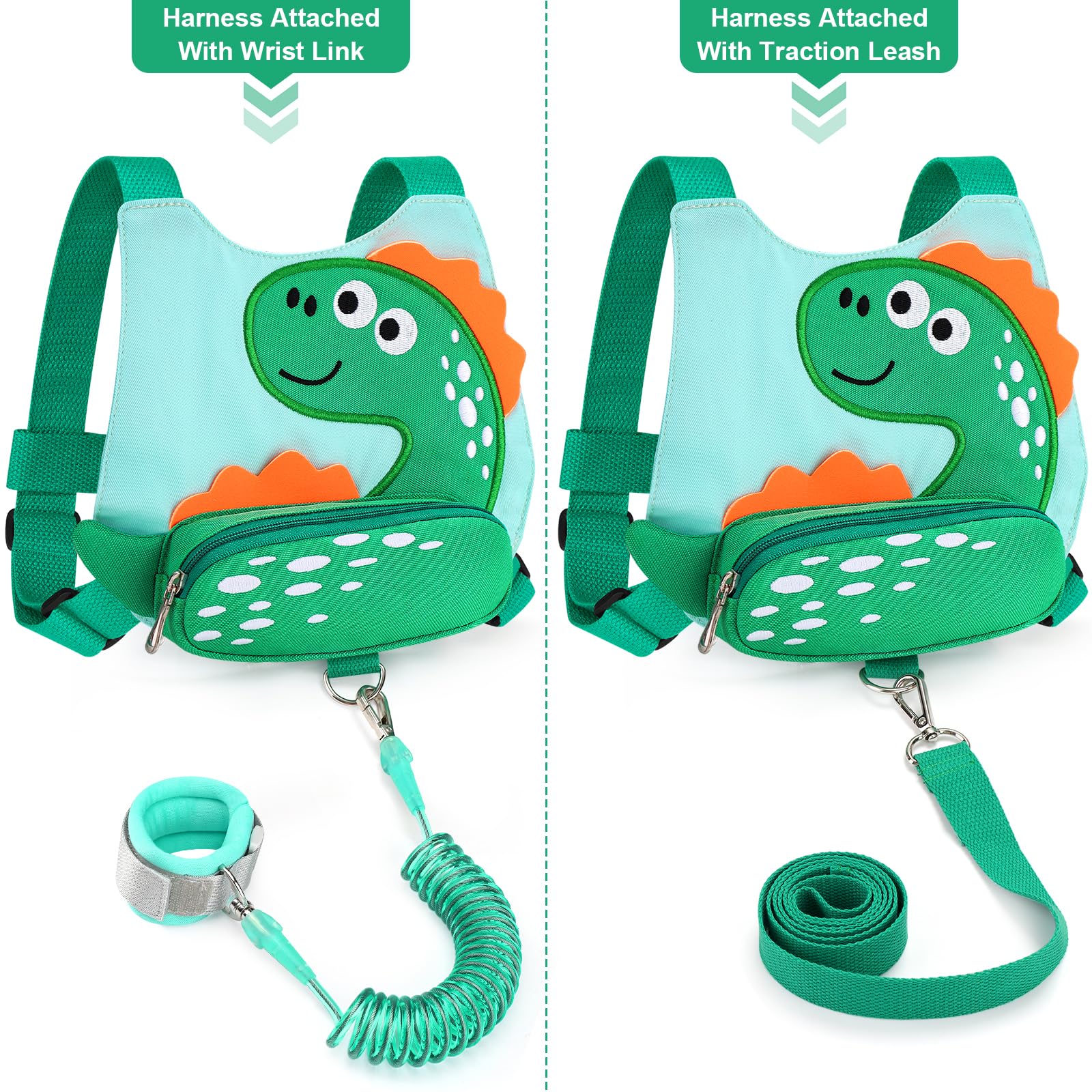 Adorable Design: This kids harness leash Cute dinosaur pattern design keep kids stimulate imagination that your child must will be very glad to wear. Front extra pocket for snacks handkerchief, the equipped anti-lost rope or other mini necessities.