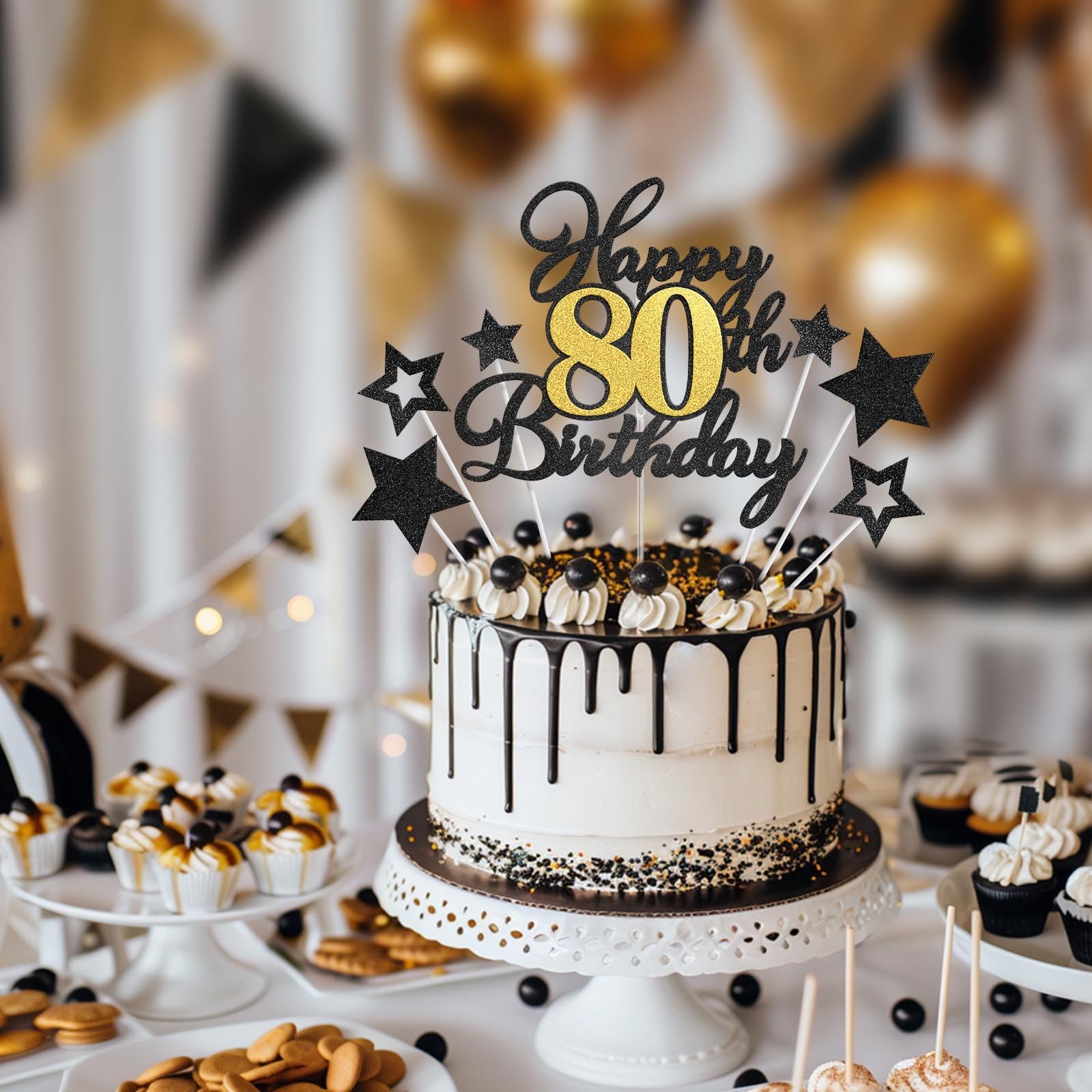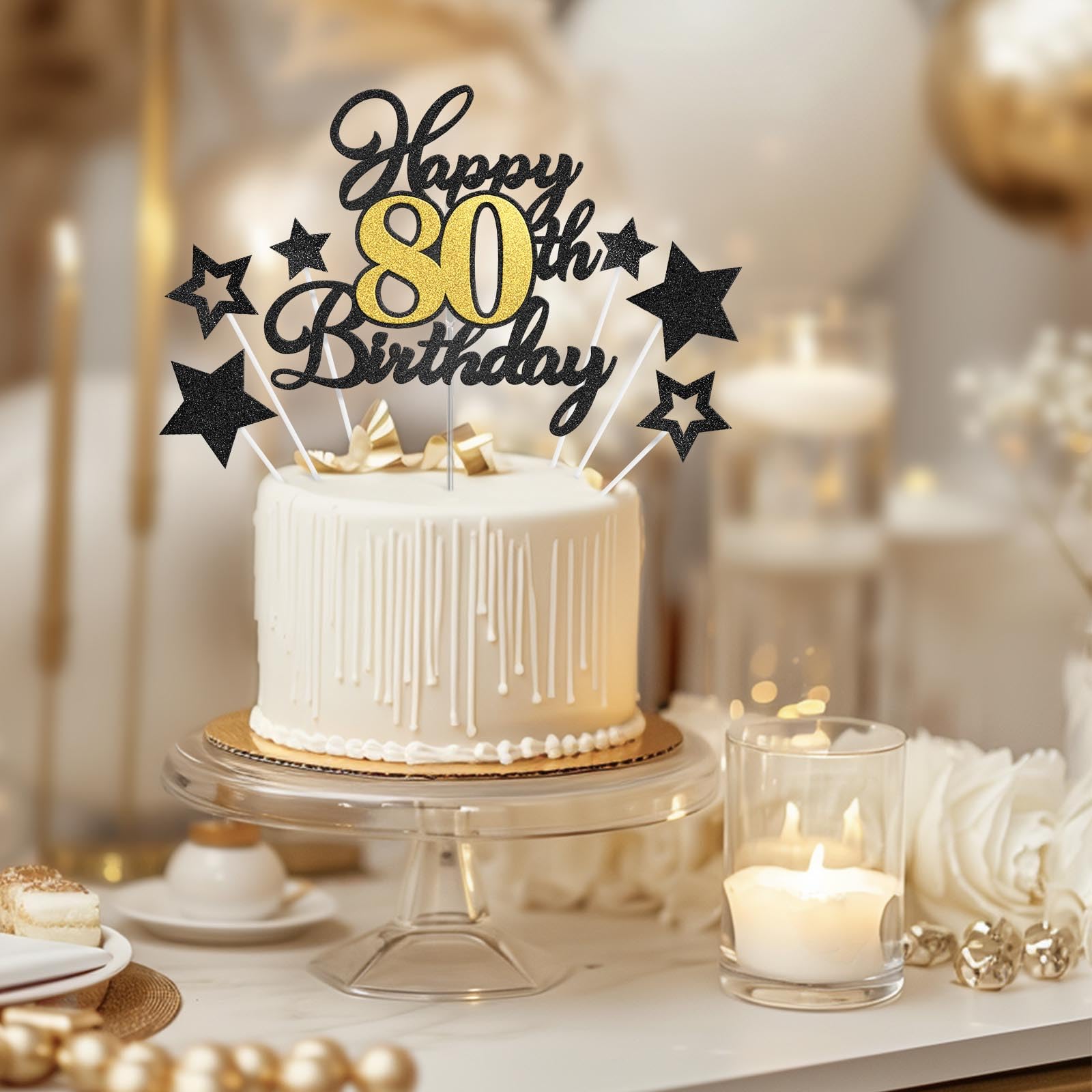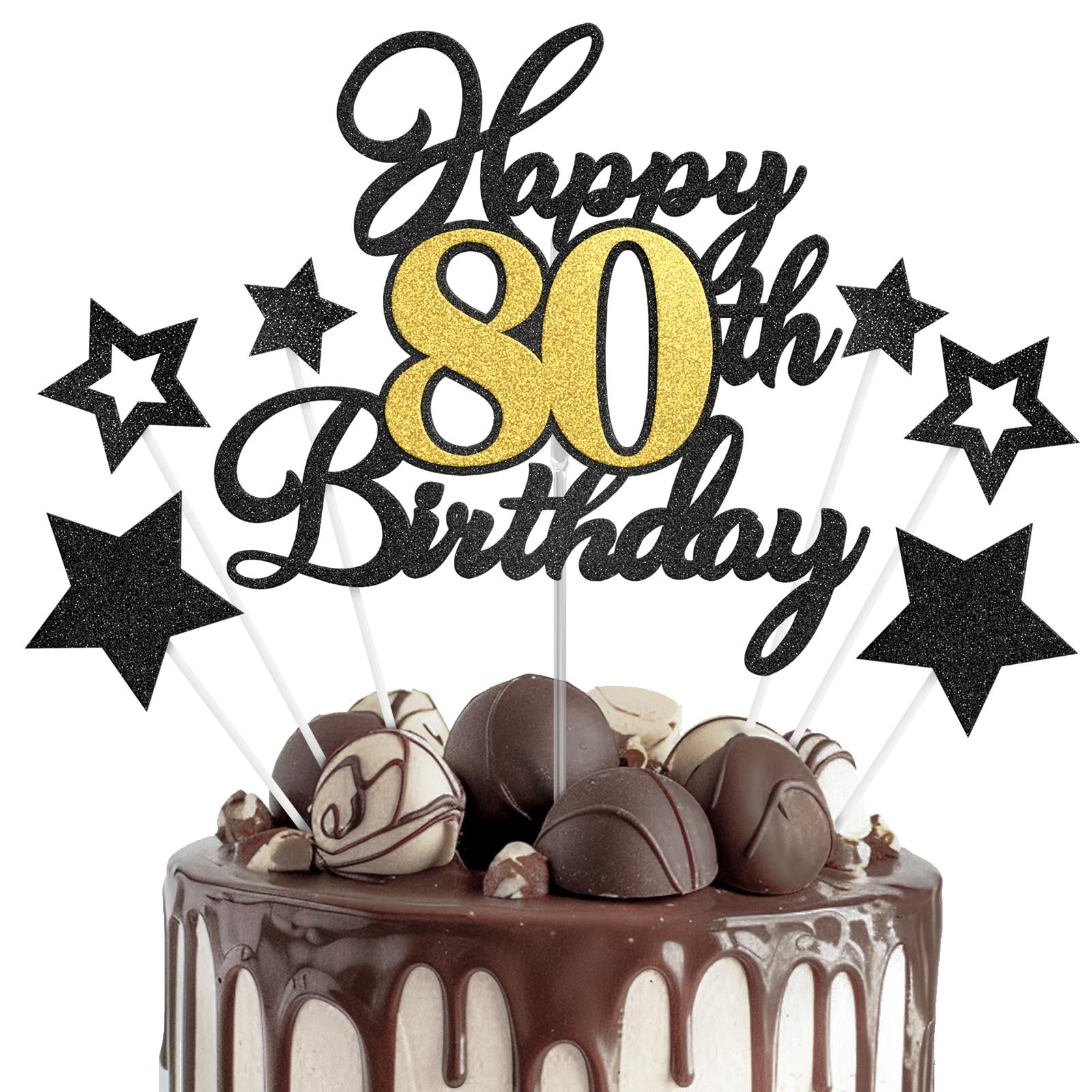 Happy 80th Birthday Cake Topper for Happy 80th Birthday Theme Party Cake Decorations Supplies. Ideal for happy 80 birthday theme party, 80th anniversary theme party cake decorations supplies. Attention: This cake topper features glitter on one side and is white on the other. It's meant for decoration only, so please do not place it in the oven or microwave. Specifications: Material: - Glitter card stock + Plastic stick - Adhesive dots Package Includes: - 1 pc Happy 80th Birthday cake topper - 1 pc Food-Grade clear plastic stick - 6 pcs Black glitter stars - 6 pcs White plastic sticks - 10 pcs Adhesive dots