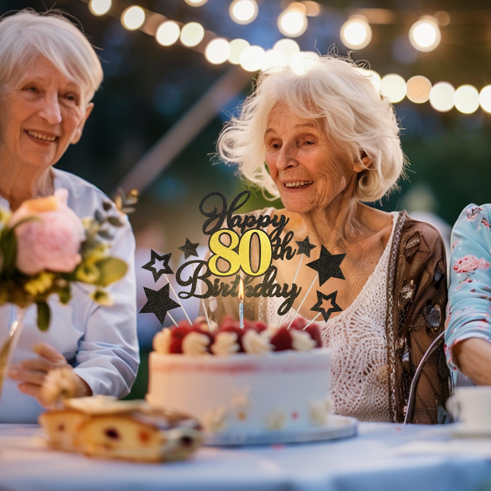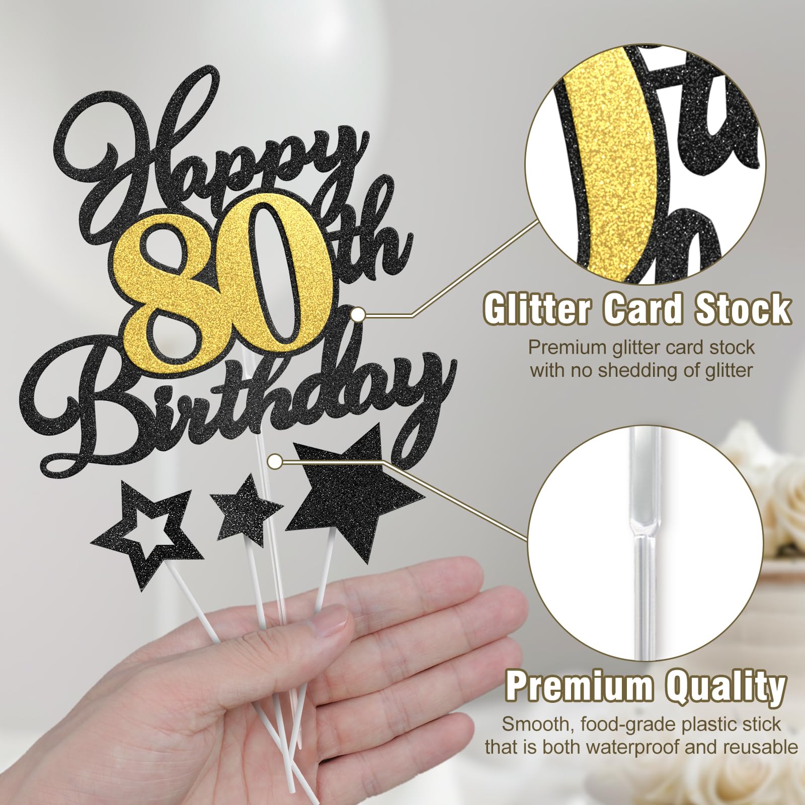 Stylish and Elegant Design: Happy 80th Birthday cake topper with star decorations, crafted from the same glitter card stock, shines brightly, bringing a unique charm to any birthday cake, making it more elegant, eye-catching, and enhancing the festive atmosphere.
