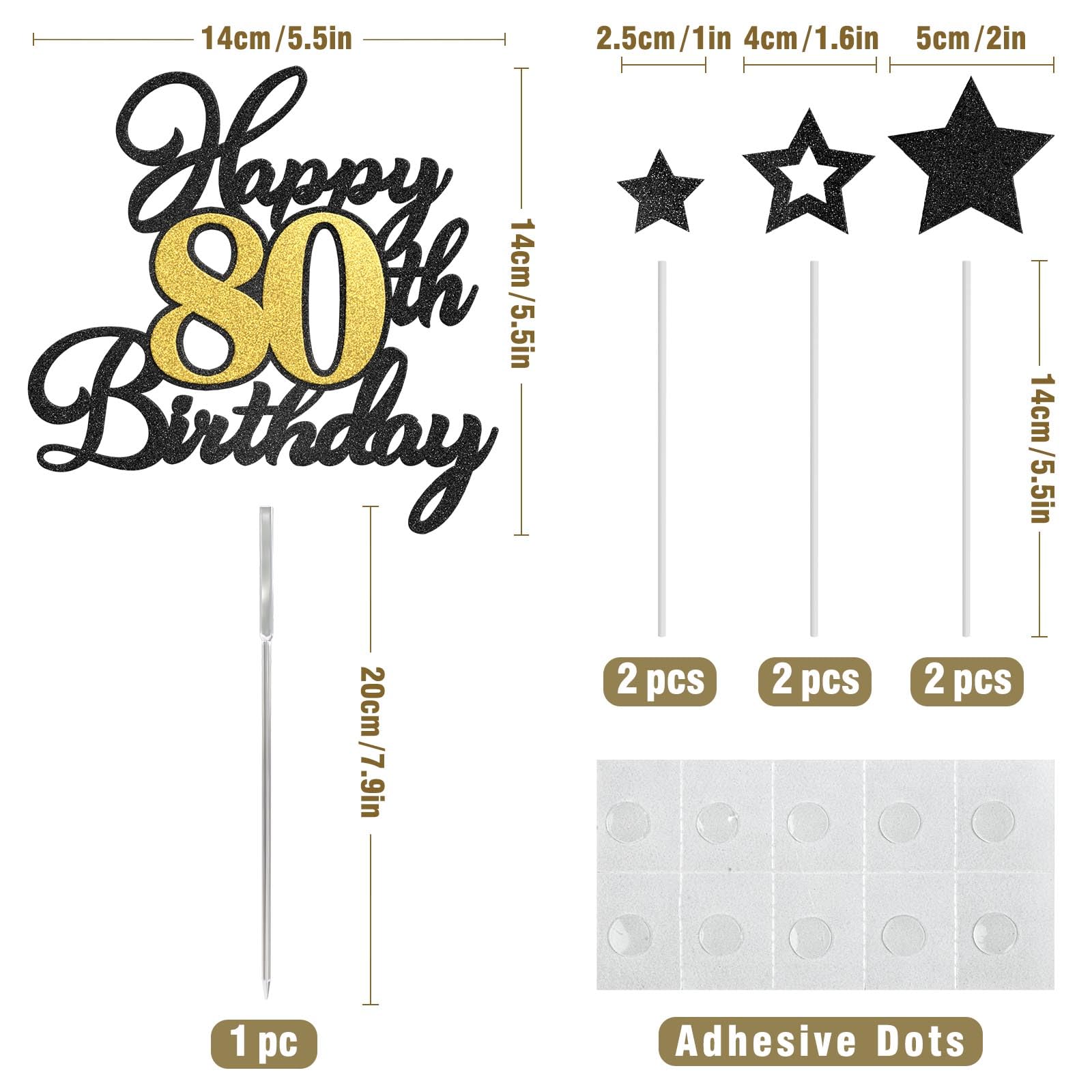Package Included: 1Pc Happy 80th Birthday cake topper, 6 pcs stars,1 pc Food-Grade clear plastic stick, 6 pcs white plastic sticks, 10 pcs adhesive dots. It's a wonderful addition to the birthday party and anniversary party.