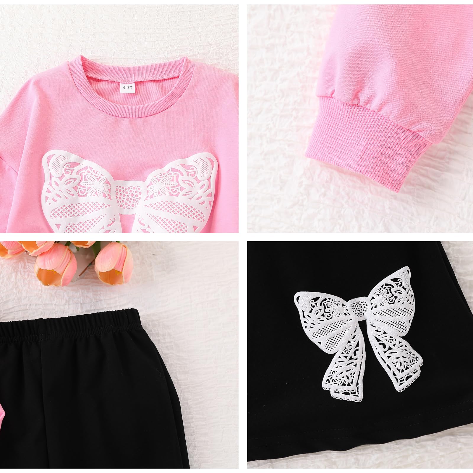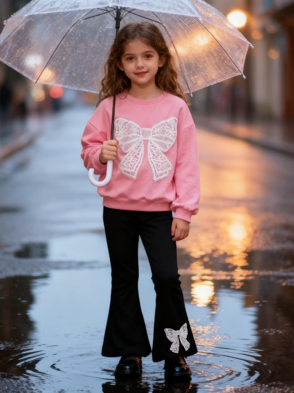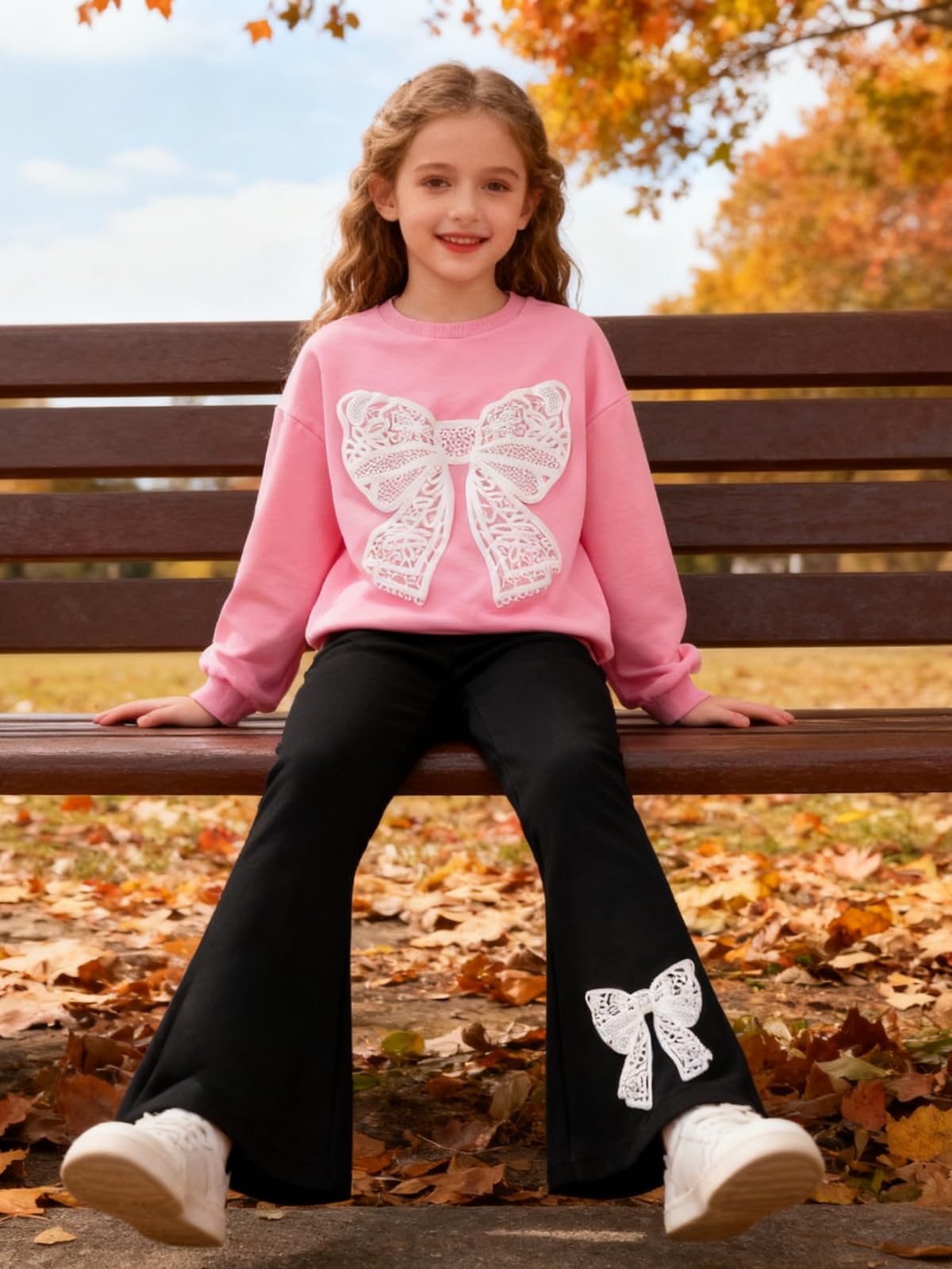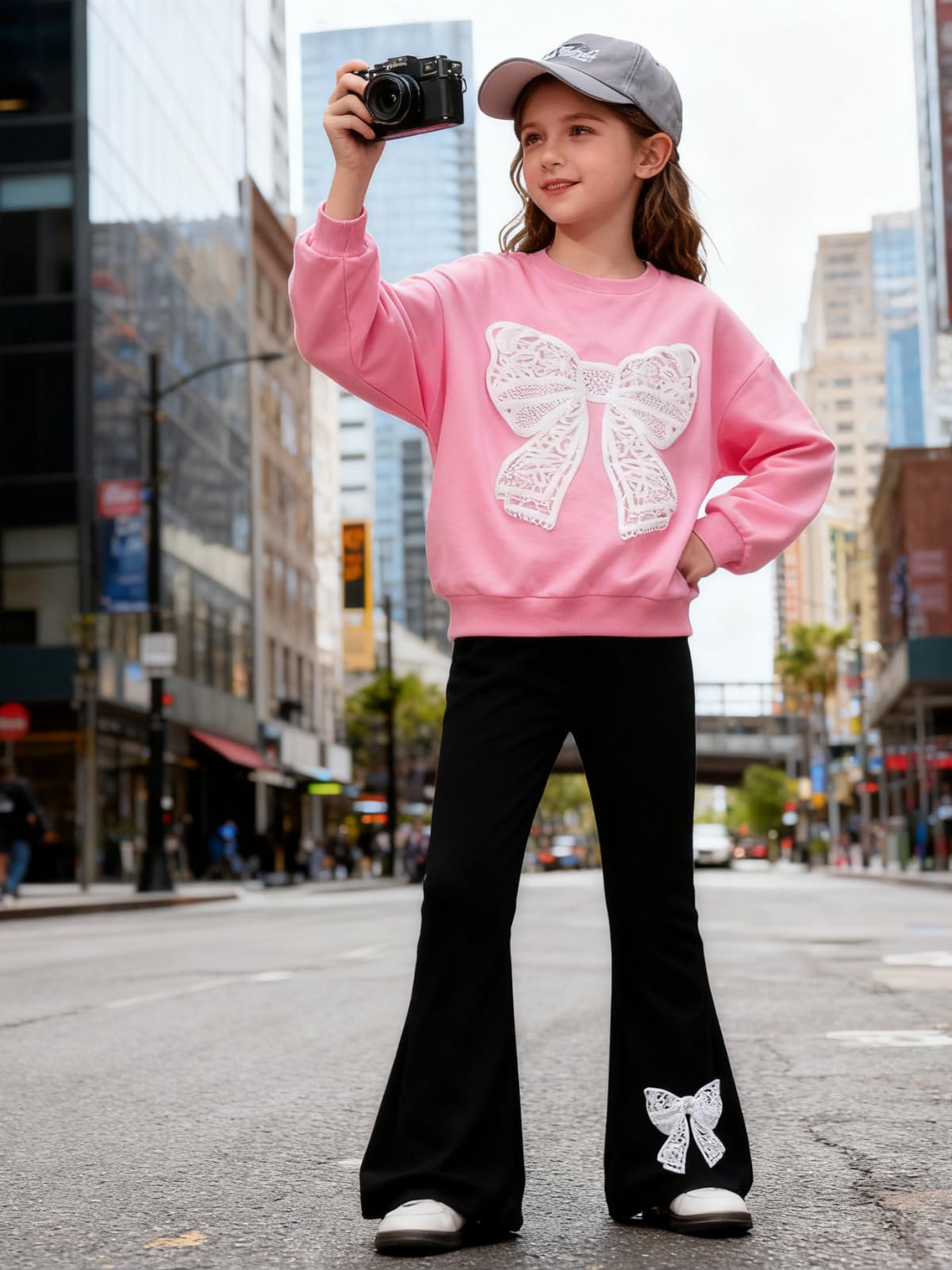 Unique Design: This elegant set features a lovely solid-color sweatshirt with a delicate lace bow and stylish flared pants. It’s a charming choice among girls outfits, designed to make your little one look both graceful and adorable