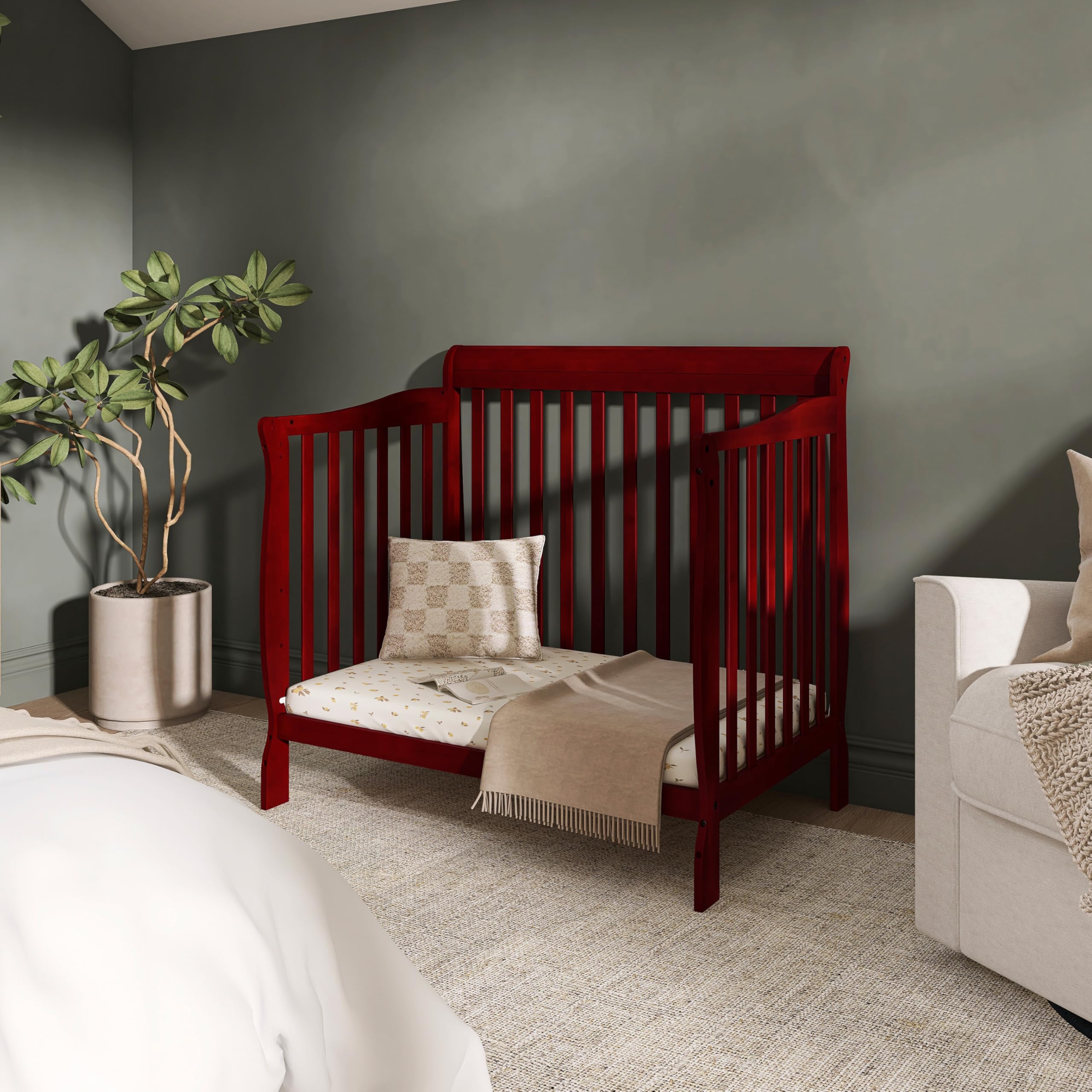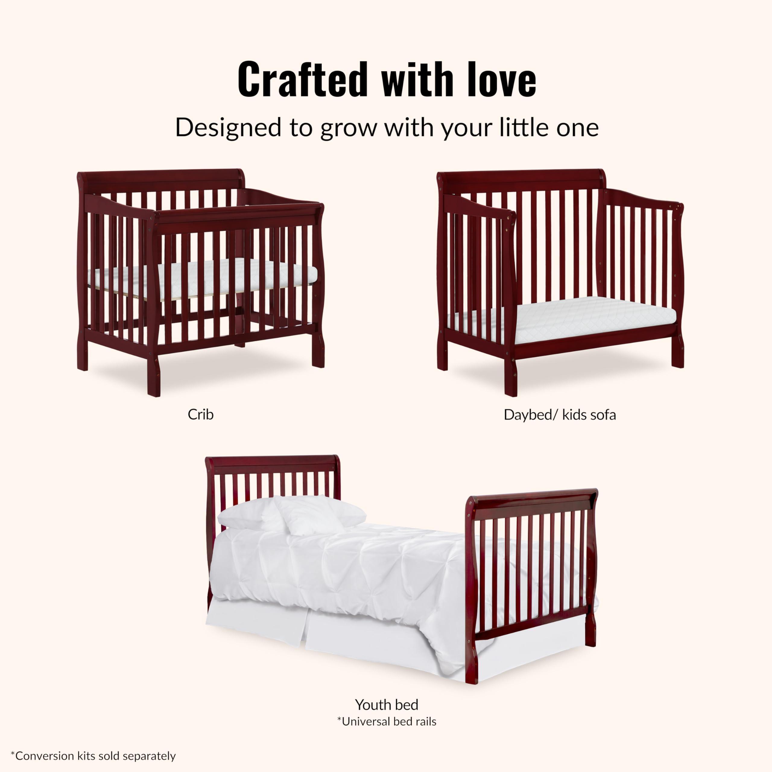 4-in-1 Convertible Mini Crib – Grows with your child from infancy through toddler years into childhood, easily converting from a mini crib to a mini daybed and a twin-size bed with and without footboard (conversion kits sold separately), delivering long-lasting value and versatility