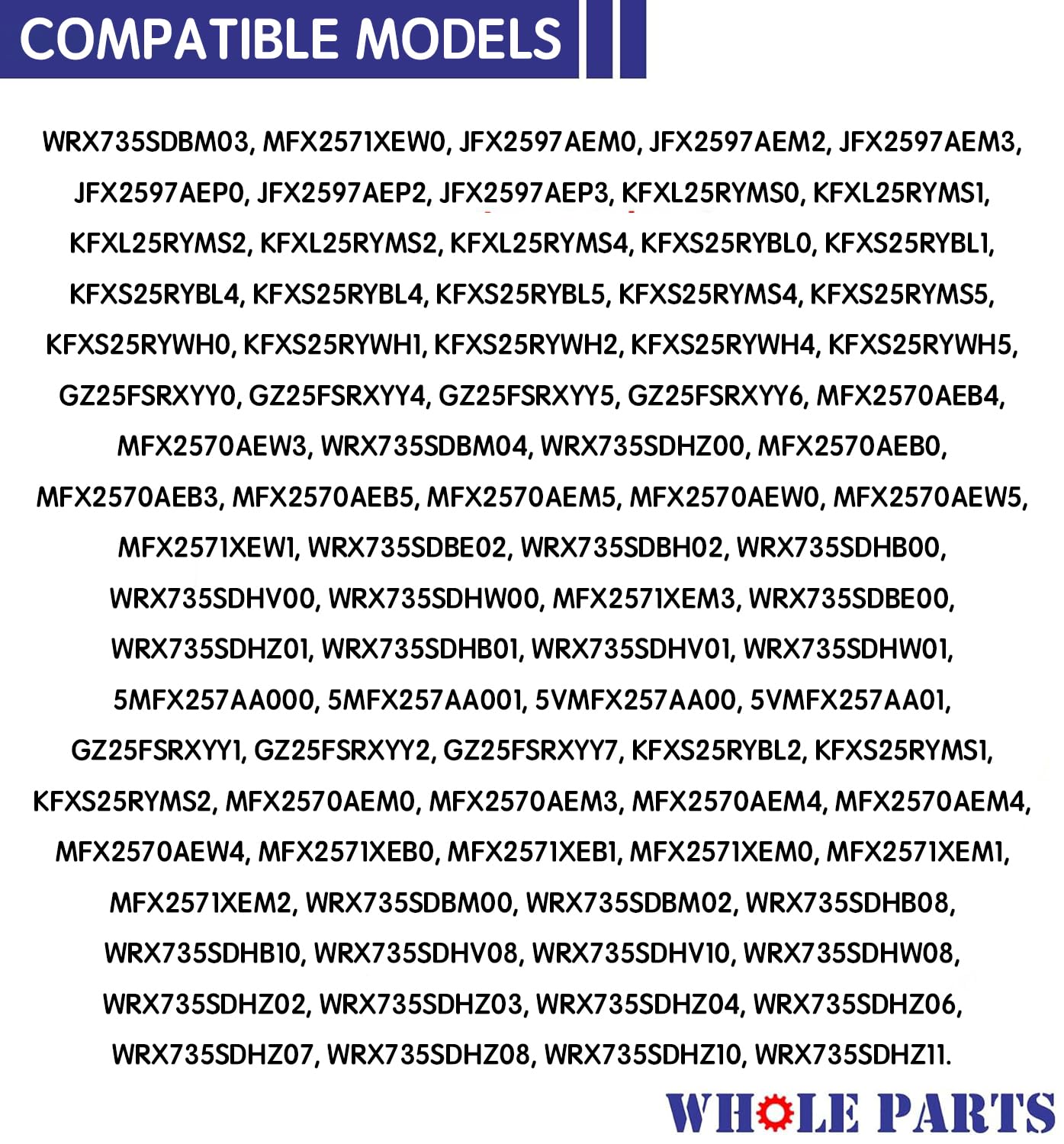 ✔️Compatible models are but not limited to: WRX735SDBM03, MFX2571XEW0, JFX2597AEM0, JFX2597AEM2, JFX2597AEM3, JFX2597AEP0, JFX2597AEP2, JFX2597AEP3, KFXL25RYMS0, KFXL25RYMS1, KFXL25RYMS2, KFXL25RYMS2, KFXL25RYMS4, KFXS25RYBL0, KFXS25RYBL1, KFXS25RYBL4, KFXS25RYBL4, KFXS25RYBL5, KFXS25RYMS4, KFXS25RYMS5, KFXS25RYWH0, KFXS25RYWH1, KFXS25RYWH2, KFXS25RYWH4, KFXS25RYWH5, GZ25FSRXYY0, GZ25FSRXYY4, GZ25FSRXYY5, GZ25FSRXYY6, MFX2570AEB4, MFX2570AEW3, WRX735SDBM04, WRX735SDHZ00, MFX2570AEB0, MFX2570AEB3, MFX2570AEB5.