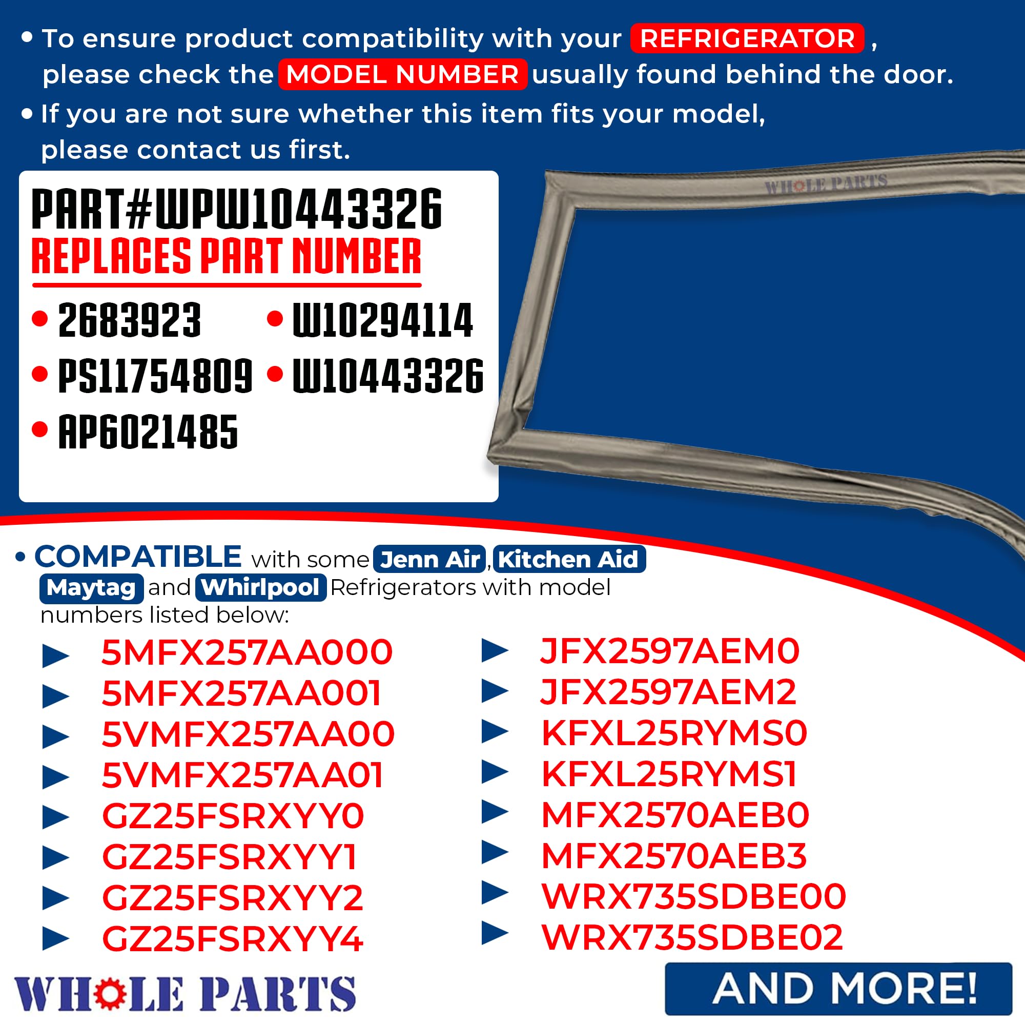 🔧Whole Parts Refrigerator Door Seal Gasket (Grey Color) Part# WPW10443326. Approximate Size is 33.94" x 8.46". This Part Replaces AP6021485, W10443326, 2683923, PS11754809, W10294114.
