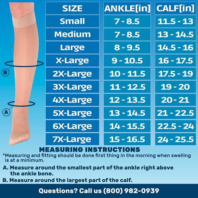 DETAILED SIZE CHART - Comprehensive size chart factoring in both calf and ankle measurements for a perfect fit.