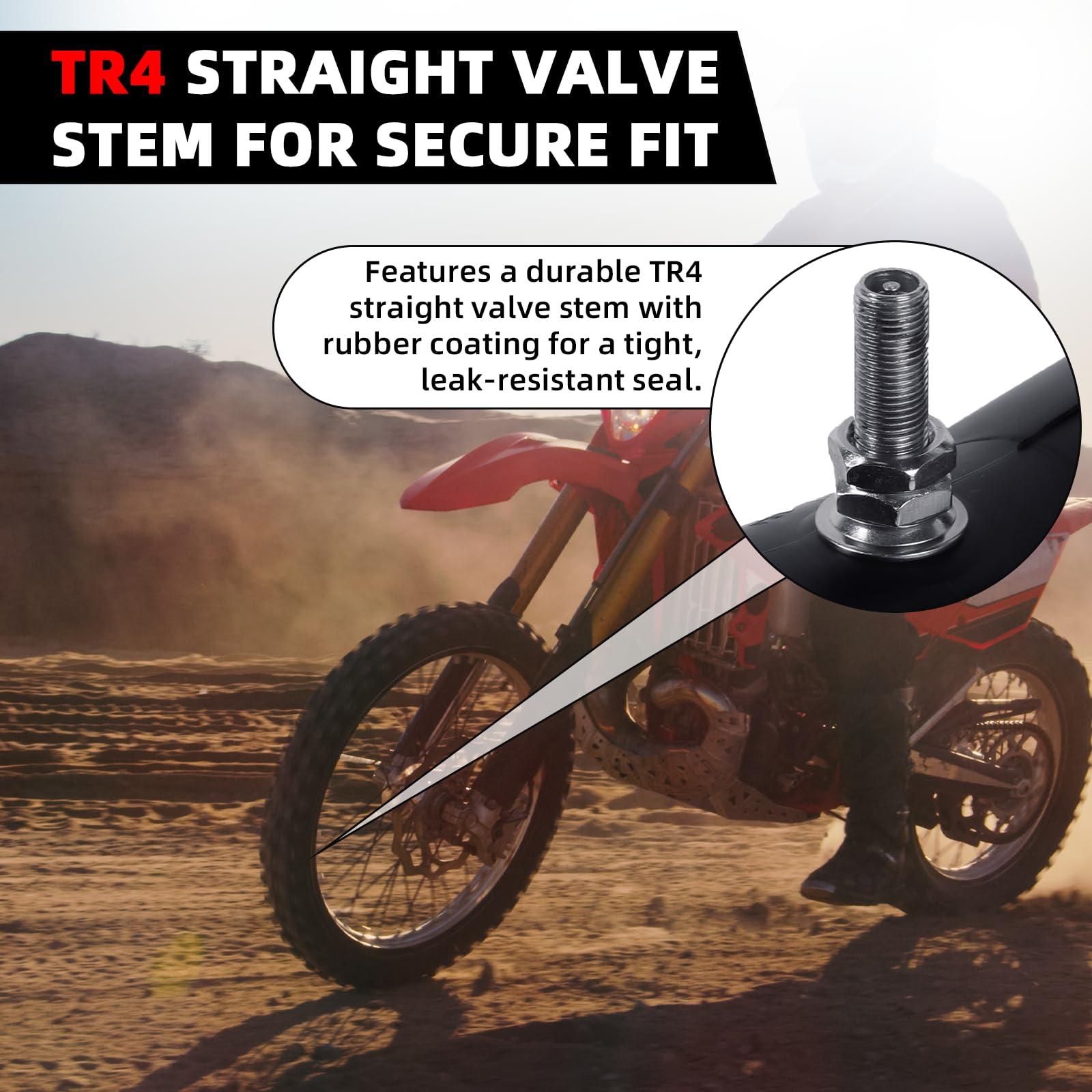 TR4 Straight Valve Stem for Secure Fit - Features a durable TR4 straight valve stem with rubber coating for a tight, leak-resistant seal. Prevents dust and sand from entering the tube, while the tear-resistant valve base extends durability and ensures reliable inflation over time.