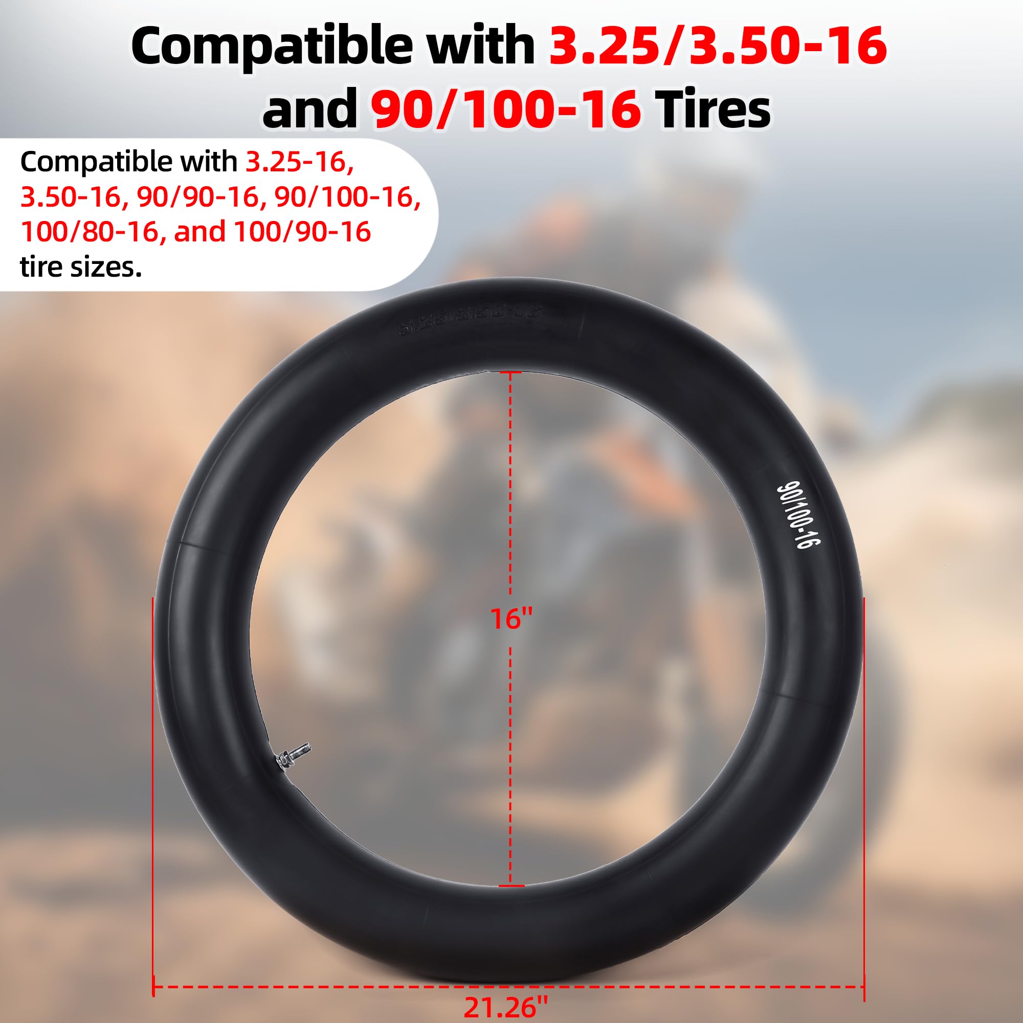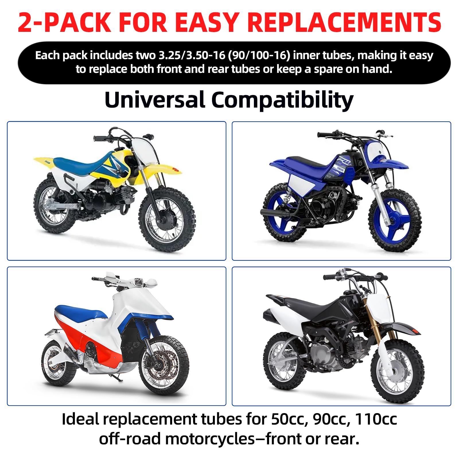 Compatible with 3.25/3.50-16 and 90/100-16 Tires - Designed to fit 16-inch dirt bike and mini pit bike tires, these heavy-duty inner tubes are compatible with 3.25-16, 3.50-16, 90/90-16, 90/100-16, 100/80-16, and 100/90-16 tire sizes. Ideal replacement tubes for 50cc, 90cc, 110cc off-road motorcycles—front or rear.