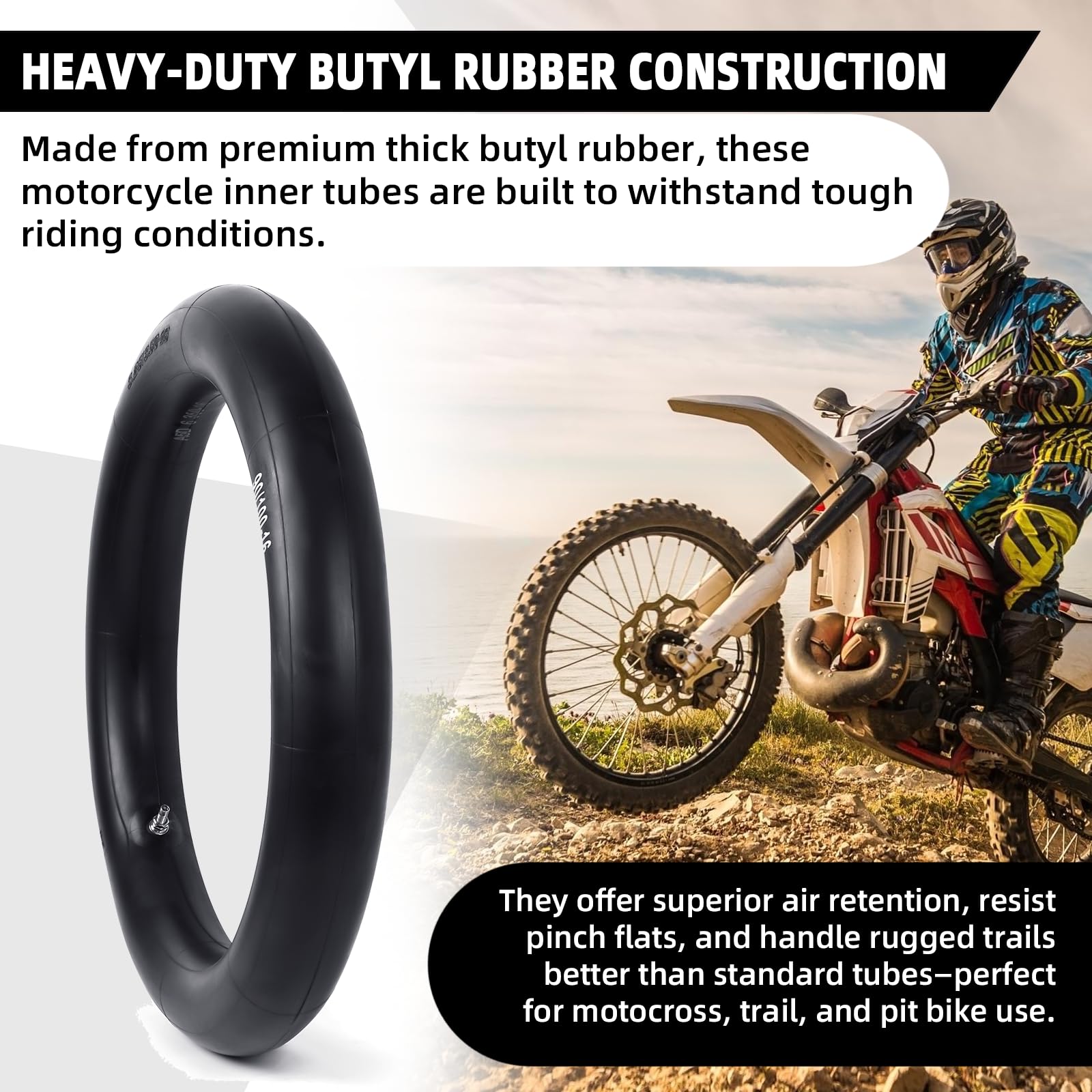 Heavy-Duty Butyl Rubber Construction - Made from premium thick butyl rubber, these motorcycle inner tubes are built to withstand tough riding conditions. They offer superior air retention, resist pinch flats, and handle rugged trails better than standard tubes—perfect for motocross, trail, and pit bike use.