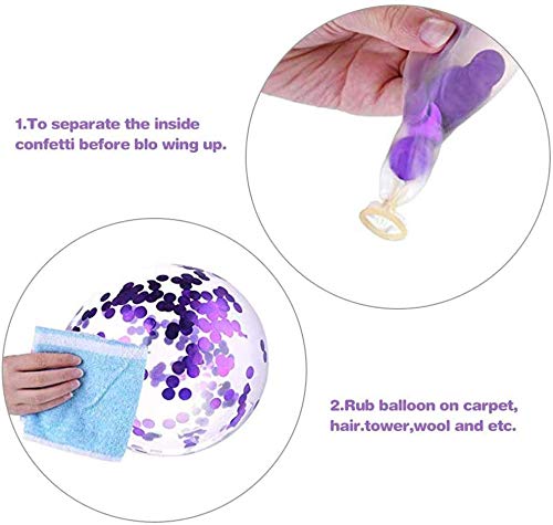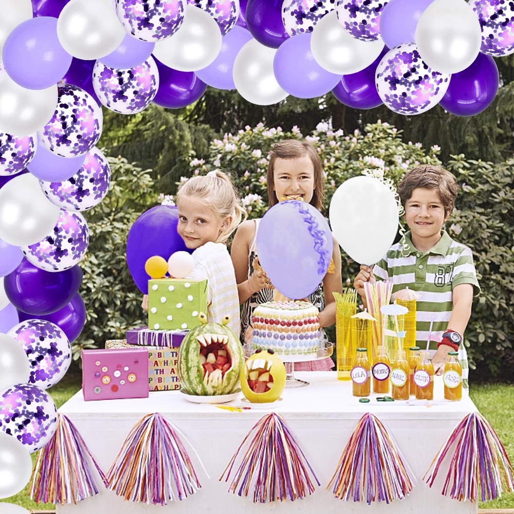 Package Contents: The purple balloon kit consists of 50pcs 12 inch balloons, including 10pcs dark purple balloons, 15pcs light purple balloons, 15pcs white balloons, 10pcs purple confetti balloons, 33ft purple balloon ribbon.