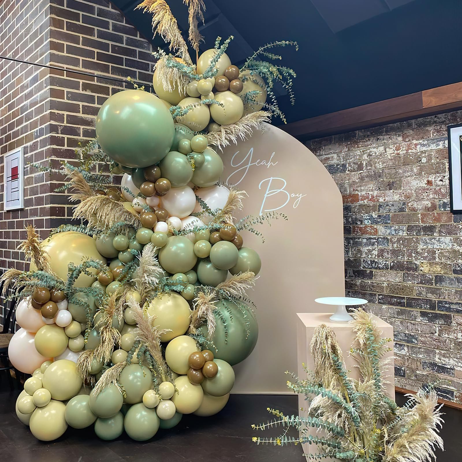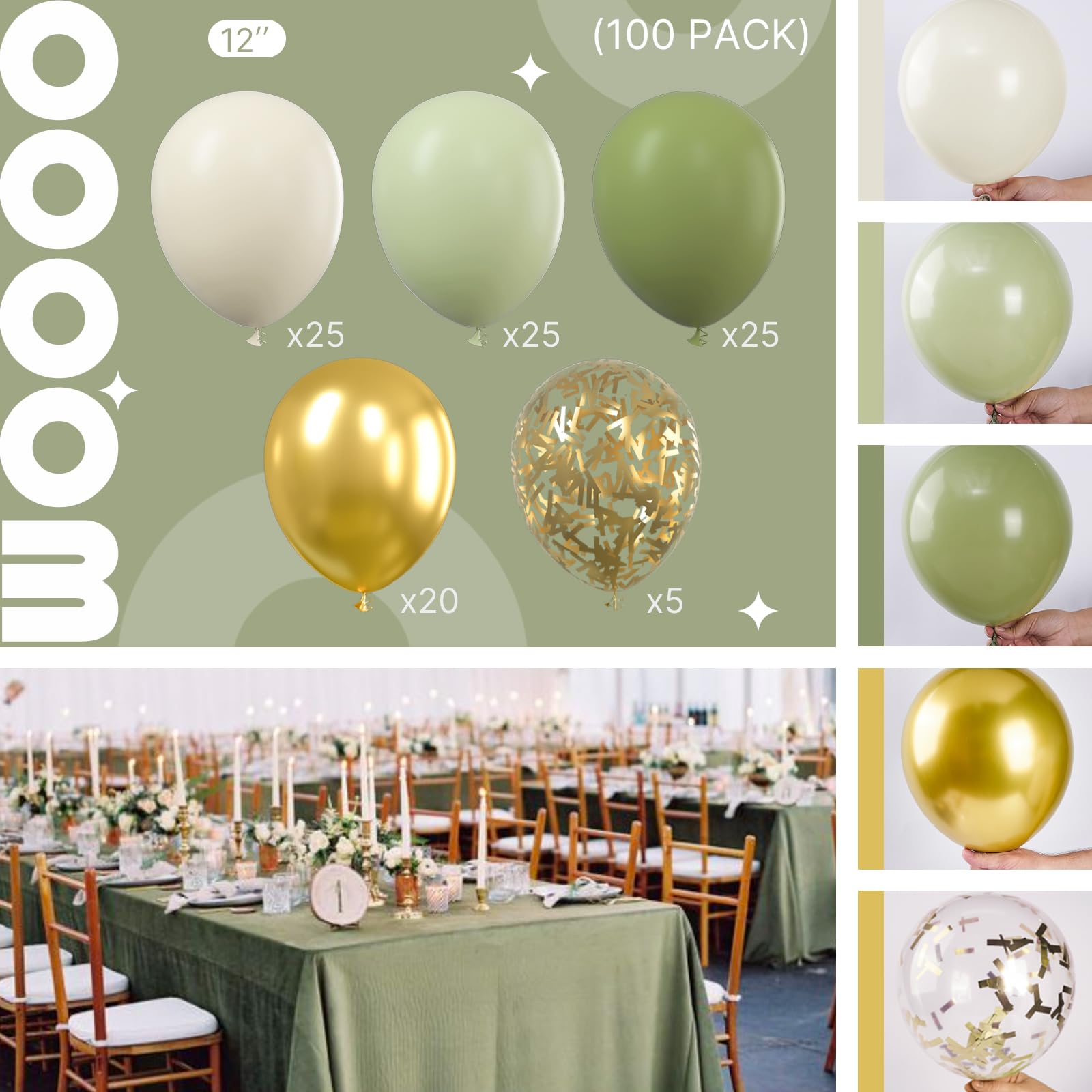12 INCH 100 PCS RETRO GREEN BALLOONS: Package comes with 12 inch white sand balloons (25 pcs), avocado green balloons (25 pcs), sage green balloons (25 pcs), gold metallic balloons (20 pcs), gold confetti balloons (5 pcs), balloon ribbon (1 roll), manual included