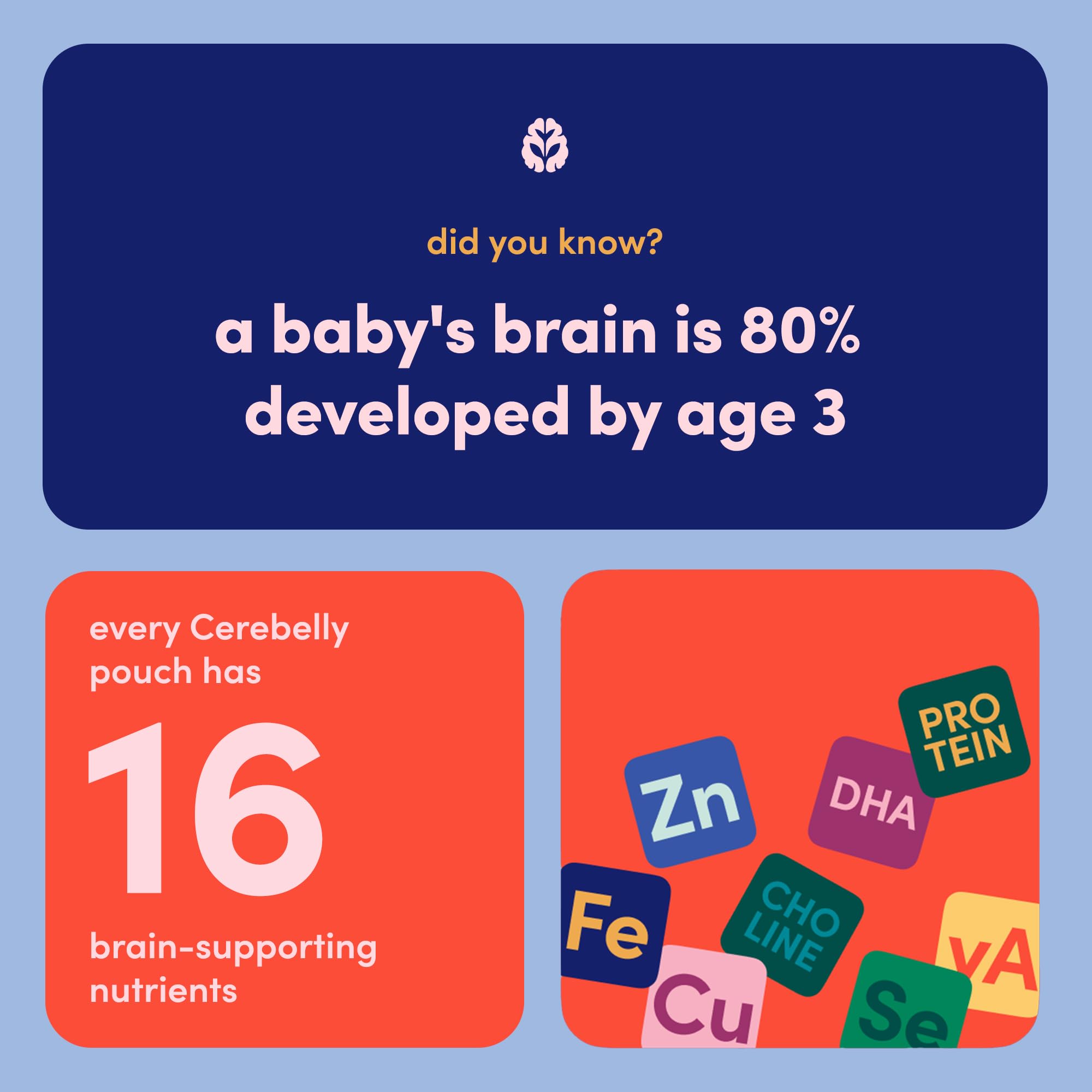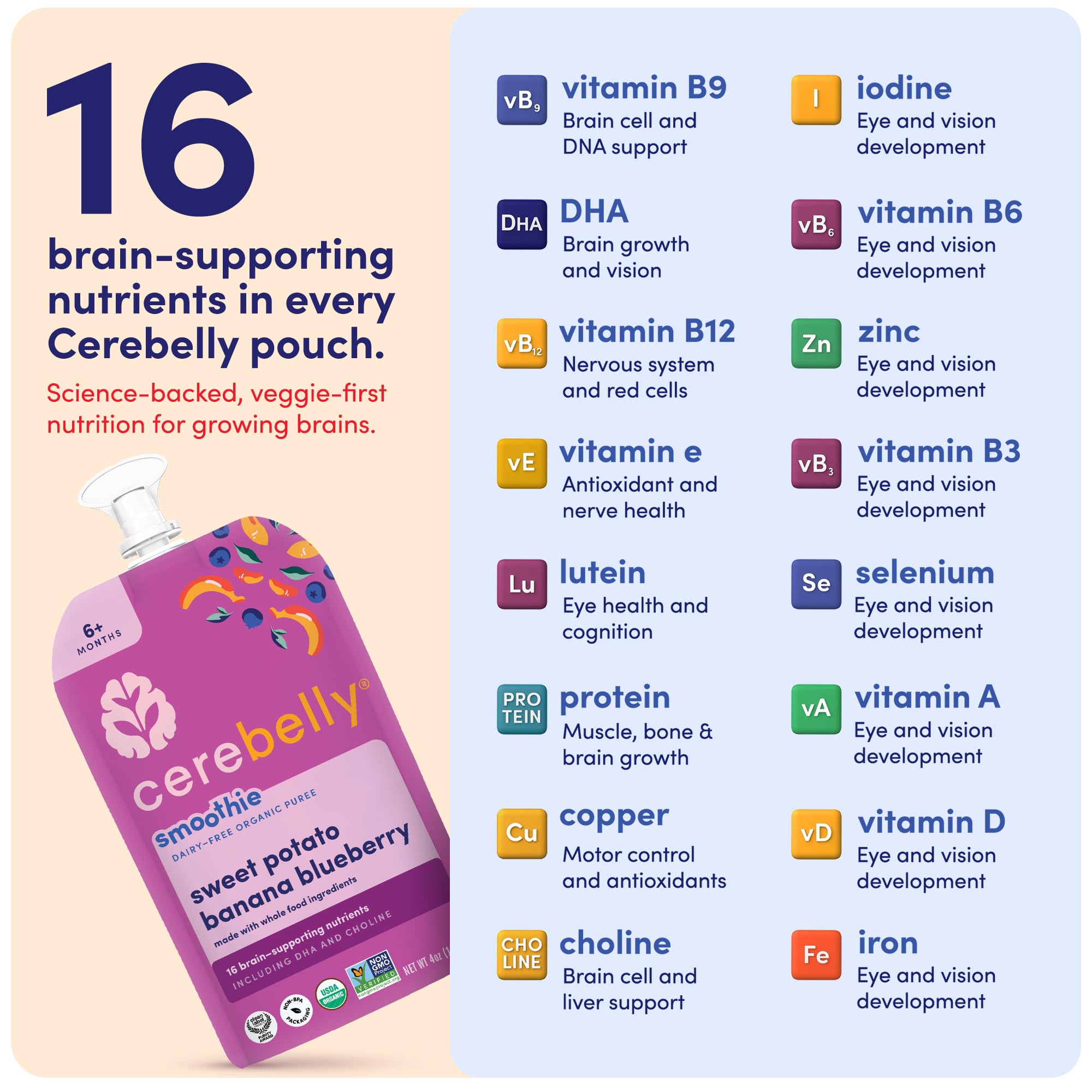 Cerebelly's Smoothie Pouches are packed with 16 brain-supporting nutrients to help your little one grow strong, making them the smart choice for baby and toddler meals or snacks. In addition to being made with whole, organic foods, our pouches have no added sugars, are gluten-free, dairy-free and nut-free. These toddler food pouches proudly carry the Clean Label Purity Award, so you know that we have rigorously tested for harmful heavy metals and toxins to ensure that every pouch puree is safe and nutritious. Cerebelly's organic fruit and vegetable pouches are here to support your child's growth journey. Rich in fiber and essential vitamins, these pouches support healthy brain and body development for babies 6 months and up. Perfect for Stage 1 and Stage 2 feeding, Cerebelly pouches offer clean, convenient nutrition on the go. SAFETY FIRST - At Cerebelly, we are committed to ensuring the highest level of product quality, which is why we rigorously test each batch to meet or exceed legal regulations and compliance. We provide expirations dates (month/dd/yyyy), best buy date (mm/dd/yyyy) and our lot code which is our manufacturing Julian date (yy-ddd) on each product so that you know your baby is safe, you have full transparency and peace of mind.