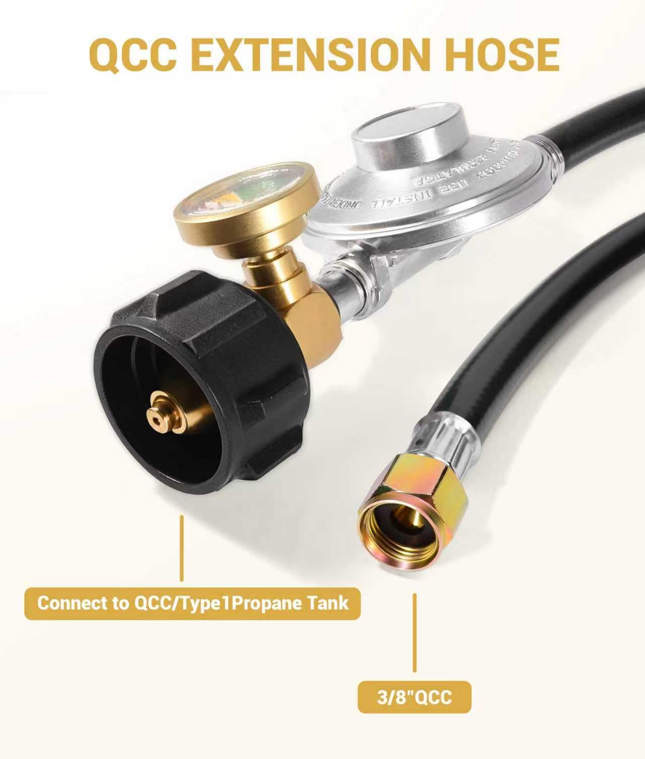 Safety Hose: The connector is meticulously designed and manufactured from 100% solid brass. The propane regulator hose features a three-layer construction: a durable, abrasion-resistant outer layer of high-quality rubber and a flame-retardant inner layer of high-strength cotton and flame-retardant PVC