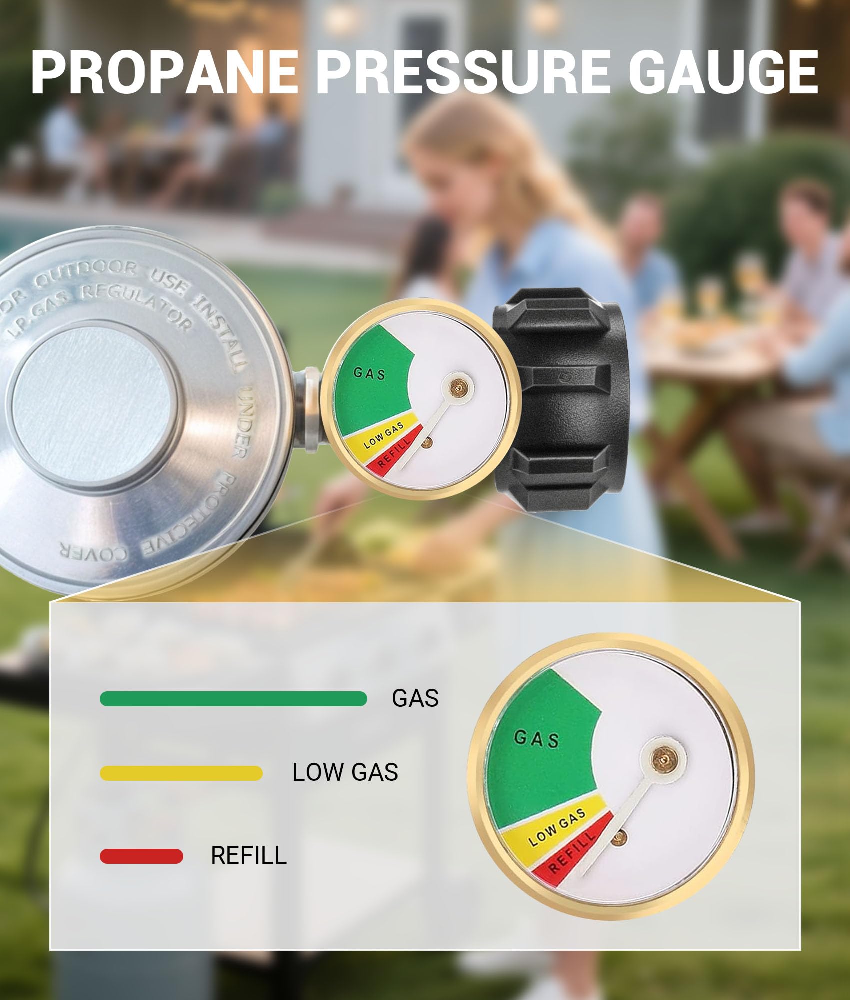 Gas Level Display: Equipped with a propane tank pressure gauge. The bright color readout allows you to easily check the gas level. The green gauge indicates sufficient gas, yellow indicates low gas, and red indicates near-empty gas