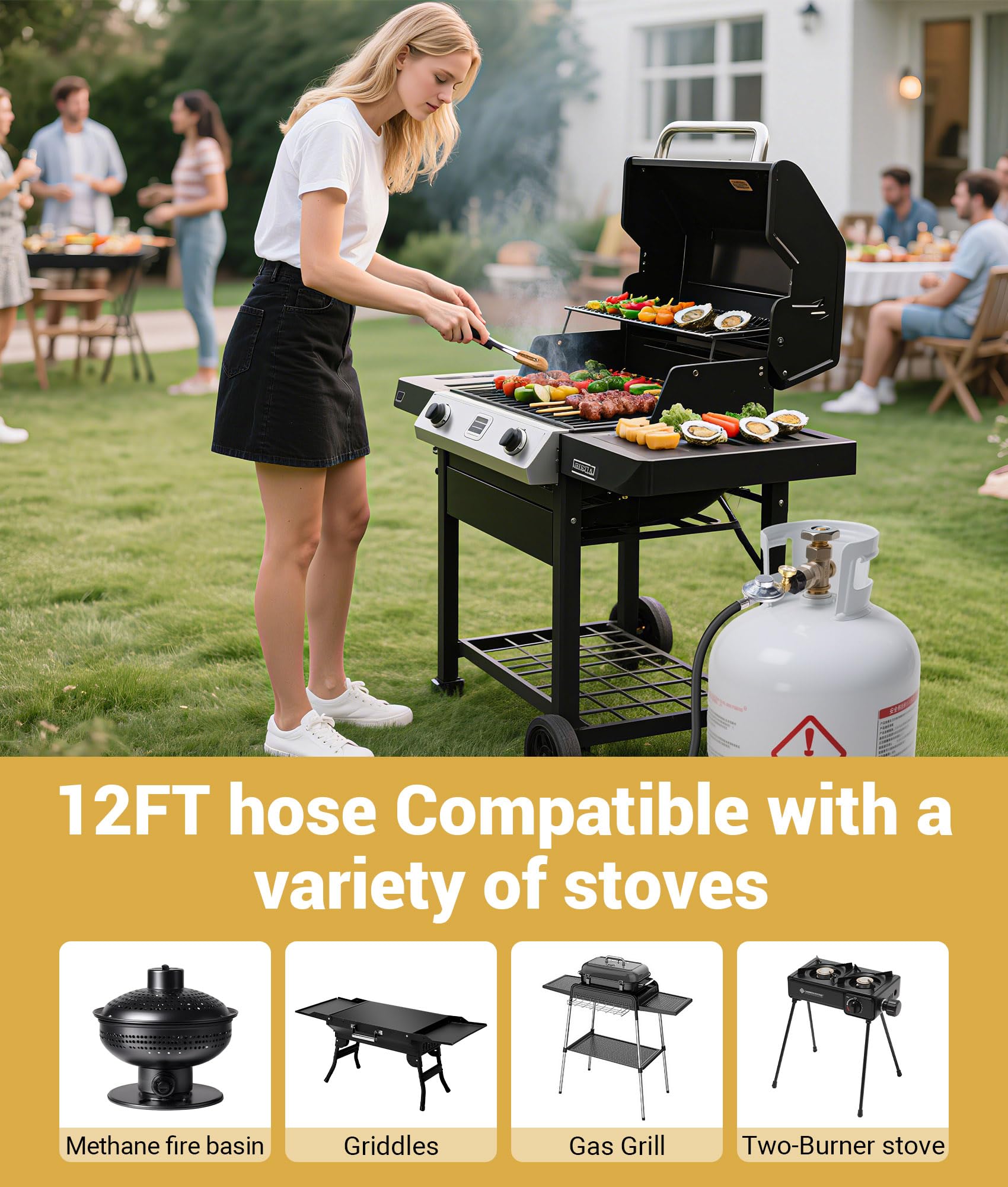 Universal Fitness: Compatible with gas grills, heaters, fire pits, LPG generators, lanterns, two-burner camping stoves, side stoves equipped with a 3/8-inch male flare connector, and can be used with most low-pressure propane gas applications