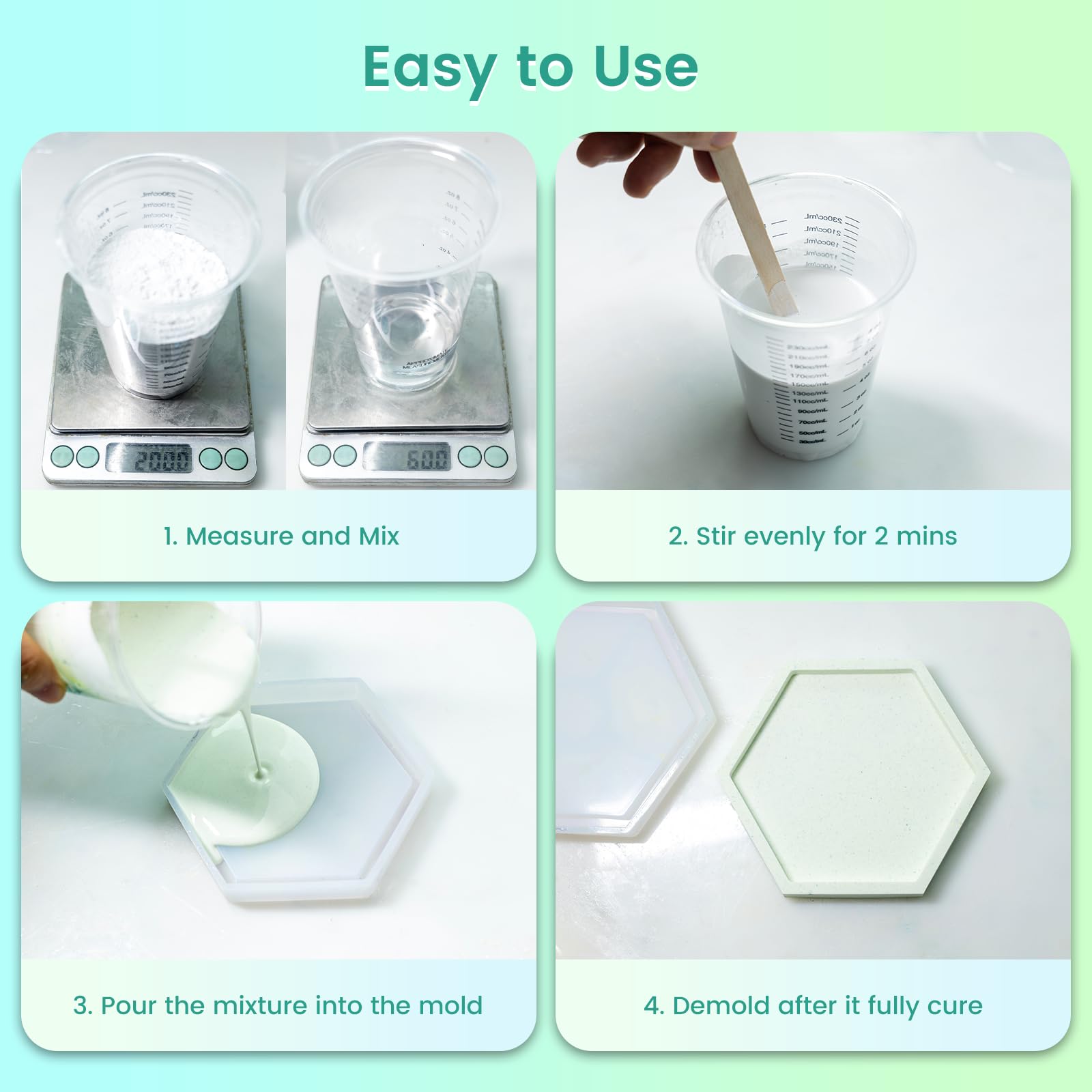 Ease of Use & Beginner Friendly: Measure the powder and water, mix thoroughly (ideal ratio: Powder to Water = 10:3 by weight), and pour into molds. Adjust the consistency by adding more or less water before pouring. After mixing with paint for 2 minutes, pour into molds. Please Note:Working time is approximately 5-10 minutes, so pour immediately after fully mixed.