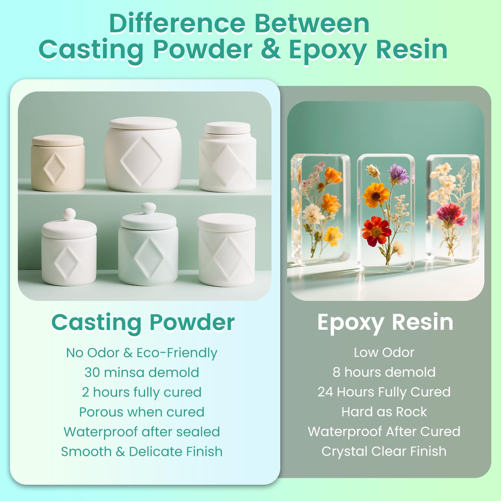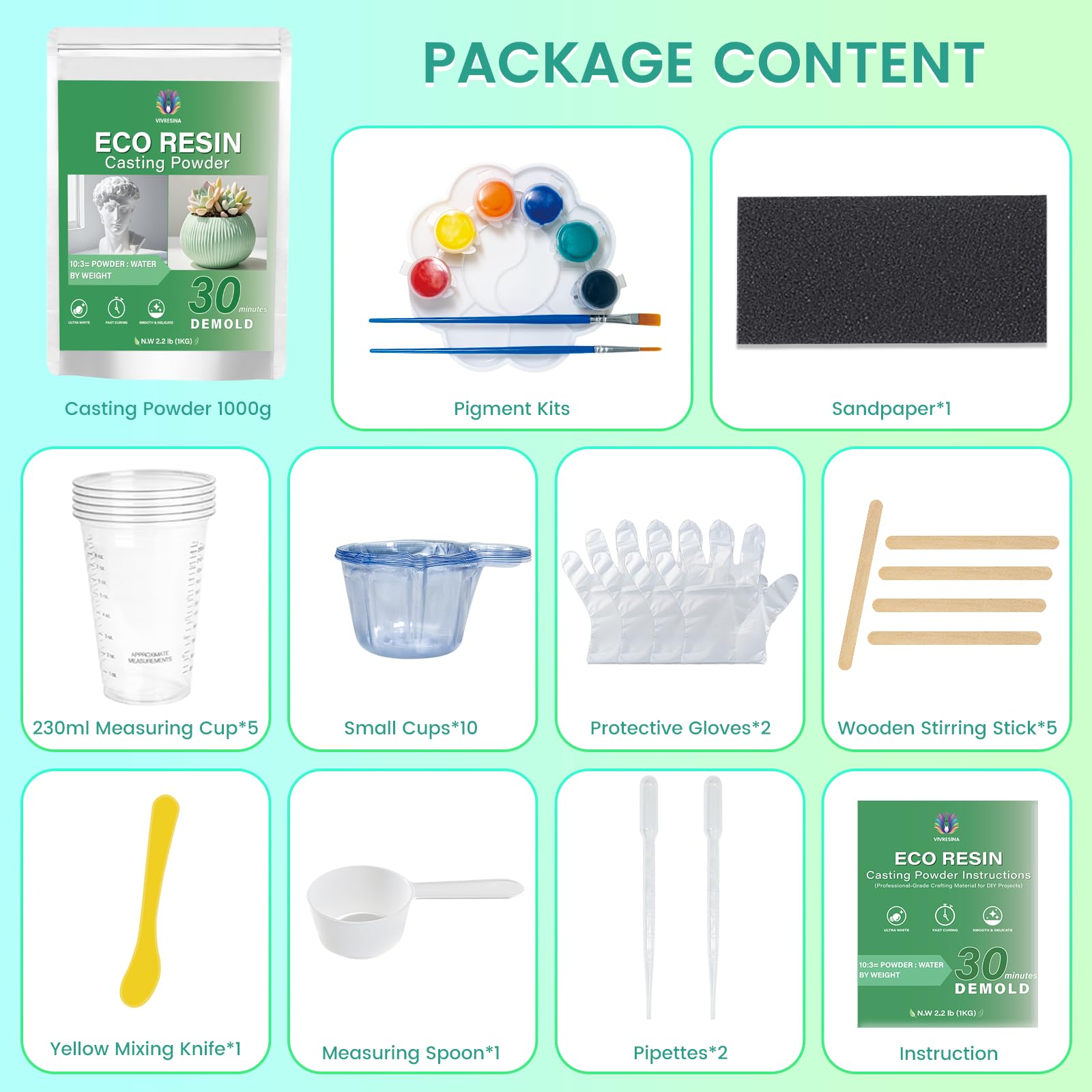 30 Minutes Demold & All in One Kit: The eco-friendly, water-activated curing and water-based formula that demolds quickly in 30 minutes, fully cures in 2 hours. Cure completely before handling to preserve fine textures.The package includes: 1000g casting powder, 1 color palette, 1 pigment pen, 5 pigments,2 pipettes , 5 mixing cups, 6 stirring sticks, 1 sandpaper, and 1 spoon.