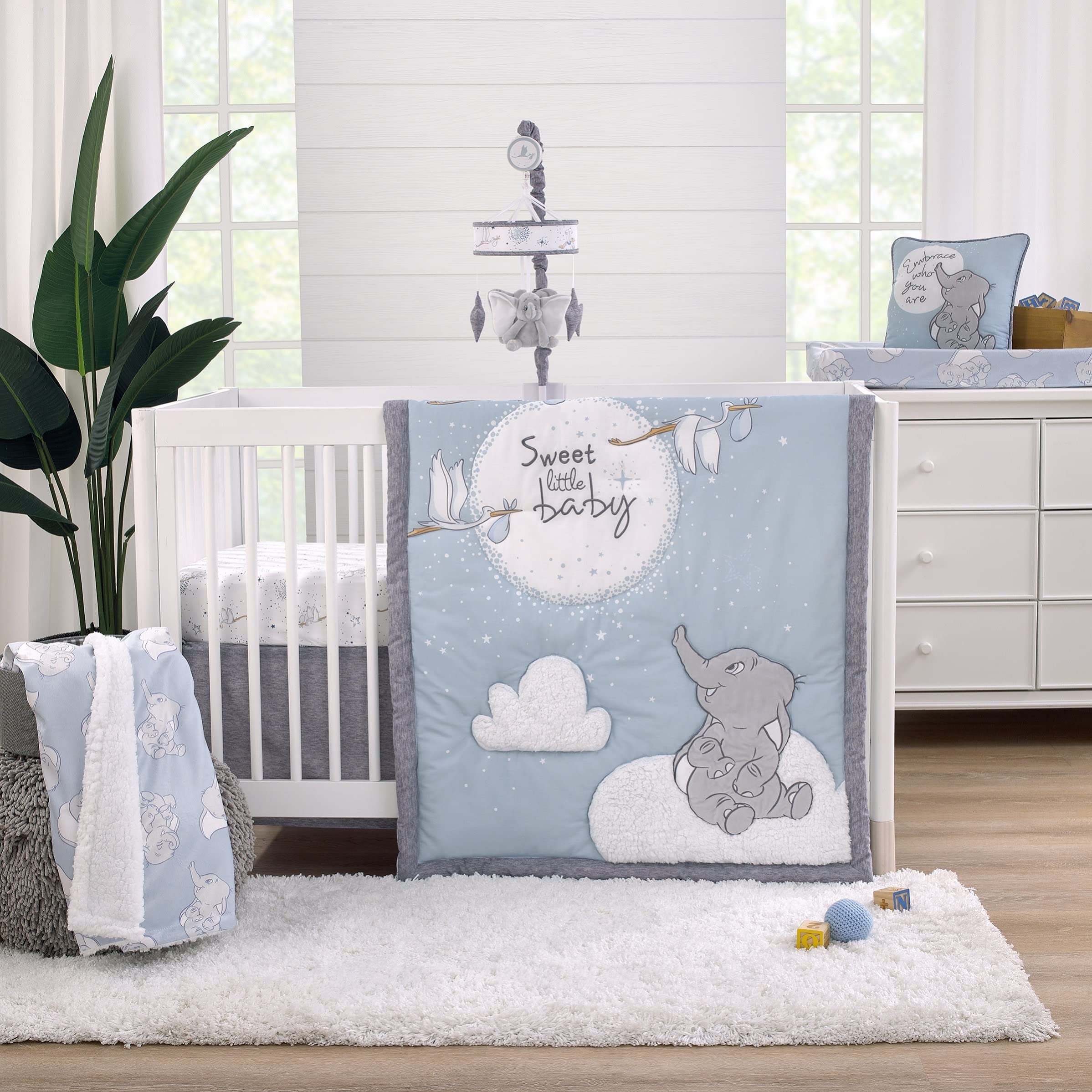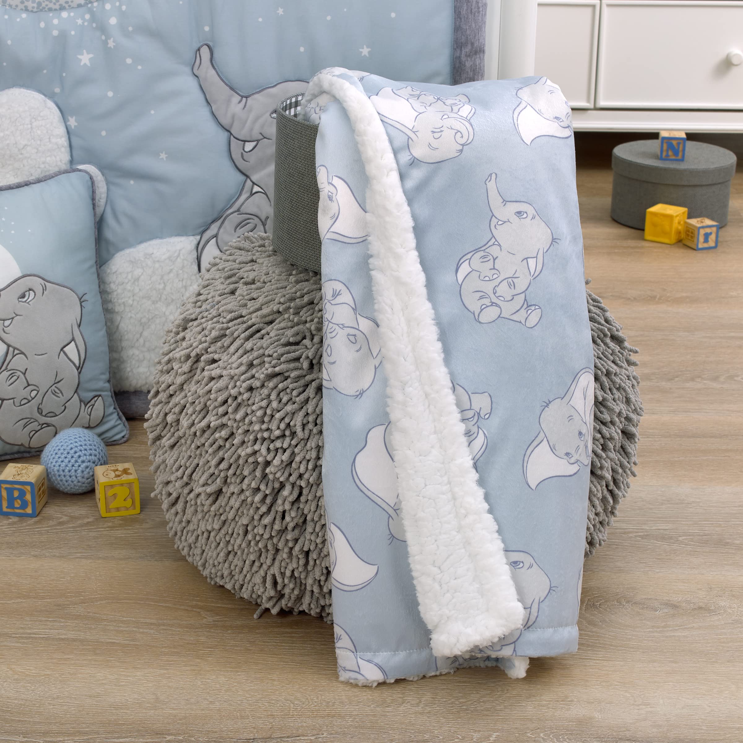 Features an adorable Dumbo pattern in shades of light blue and white, with white Sherpa back