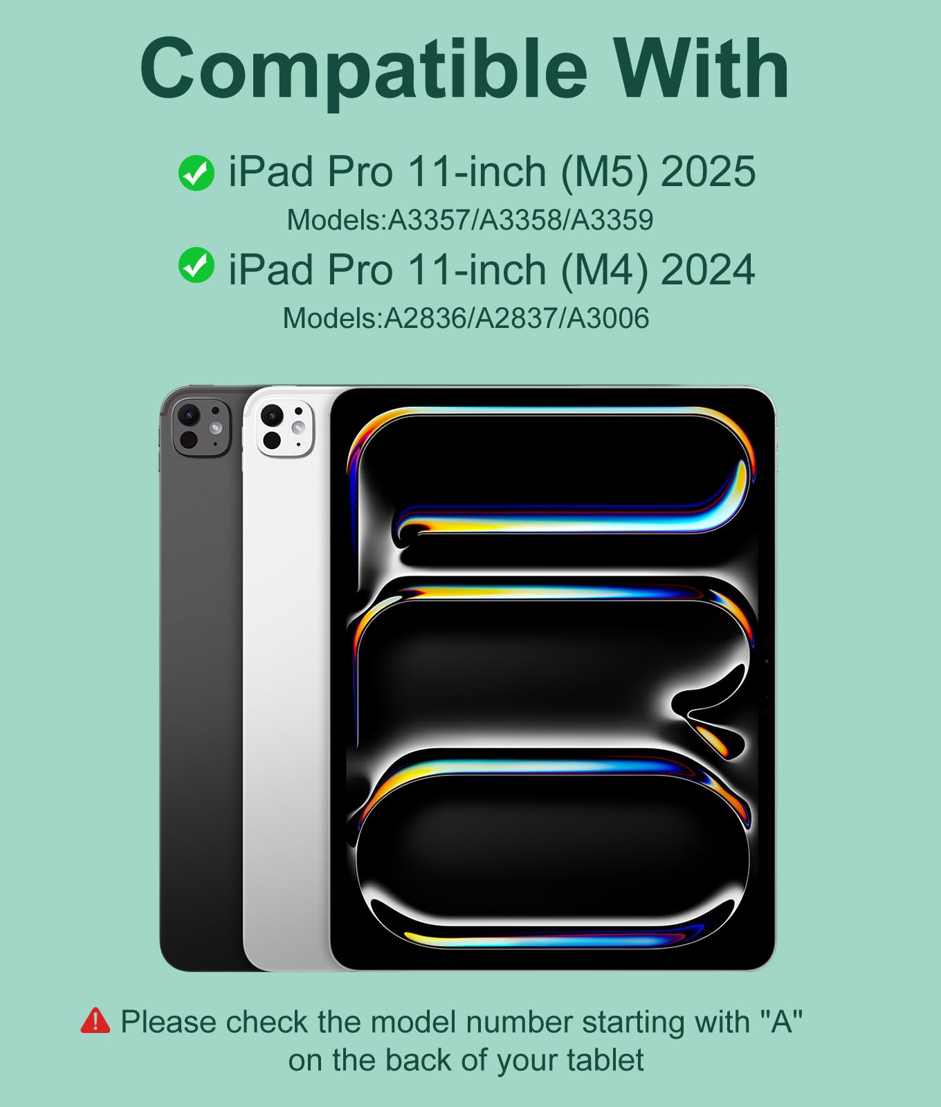Keyboard Case for iPad Pro 11-inch (M5/M4): This keyboard case ONLY compatible with iPad Pro 11 inch (M5) 2025 (Model: A3357, A3358, A3359) and compatible with iPad Pro 11 inch (M4) 2024 (Model: A2836, A2837, A3006). It is Not compatible with any other models. Please check the model number starting with "A" on the back of your tablet before purchasing