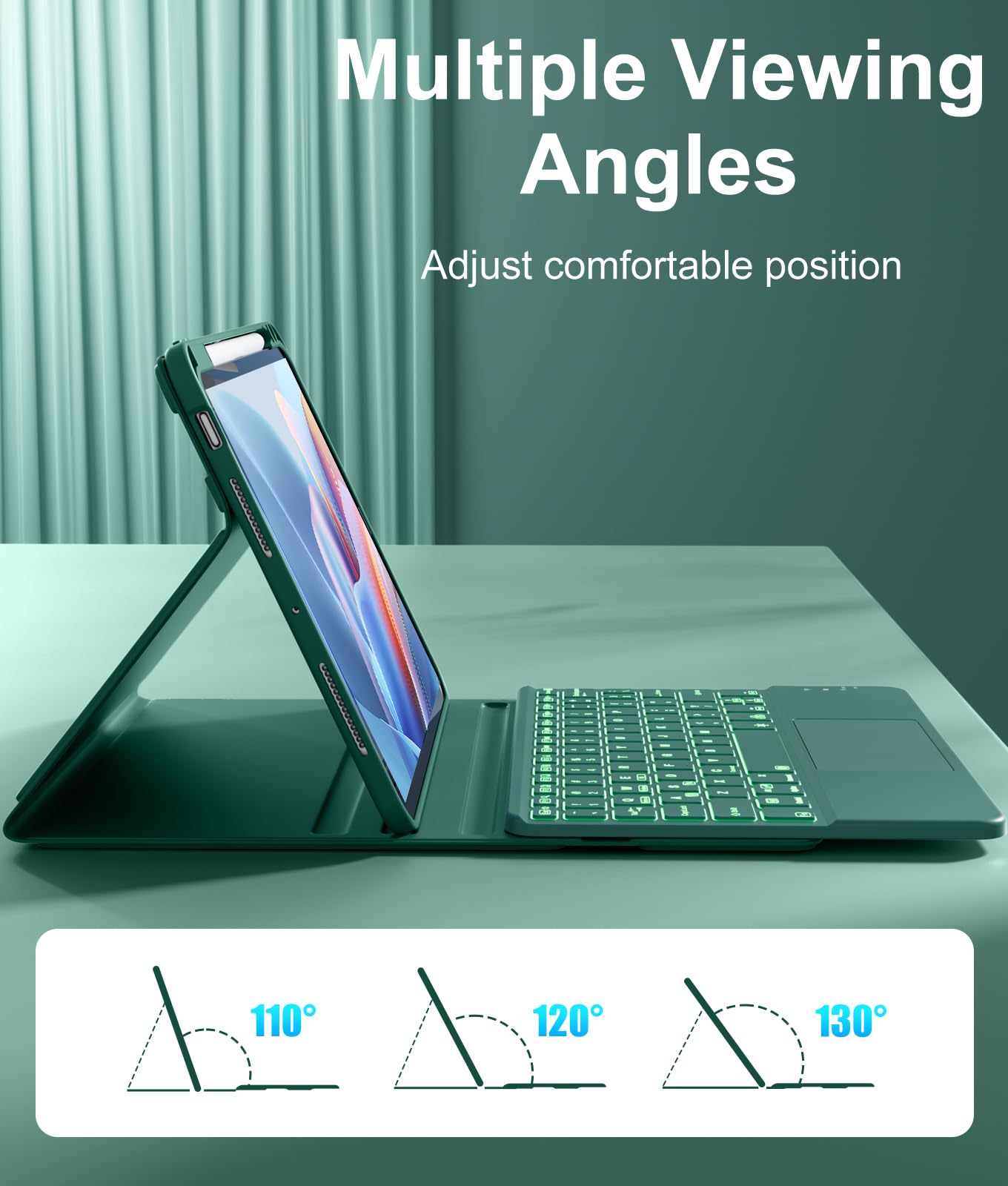 Adjustable 7 Colors Backlit Keyboard: This for iPad 11 Pro case with keyboard is designed with laser-etched backlit keys that allow 7 vibrant colors to shine in the dark, illuminated typing is more fun and atmospheric. You can choose your favorite color, bringing you different visual enjoyment. 3 levels adjustable brightness delivers an amazing typing experience in any dim condition