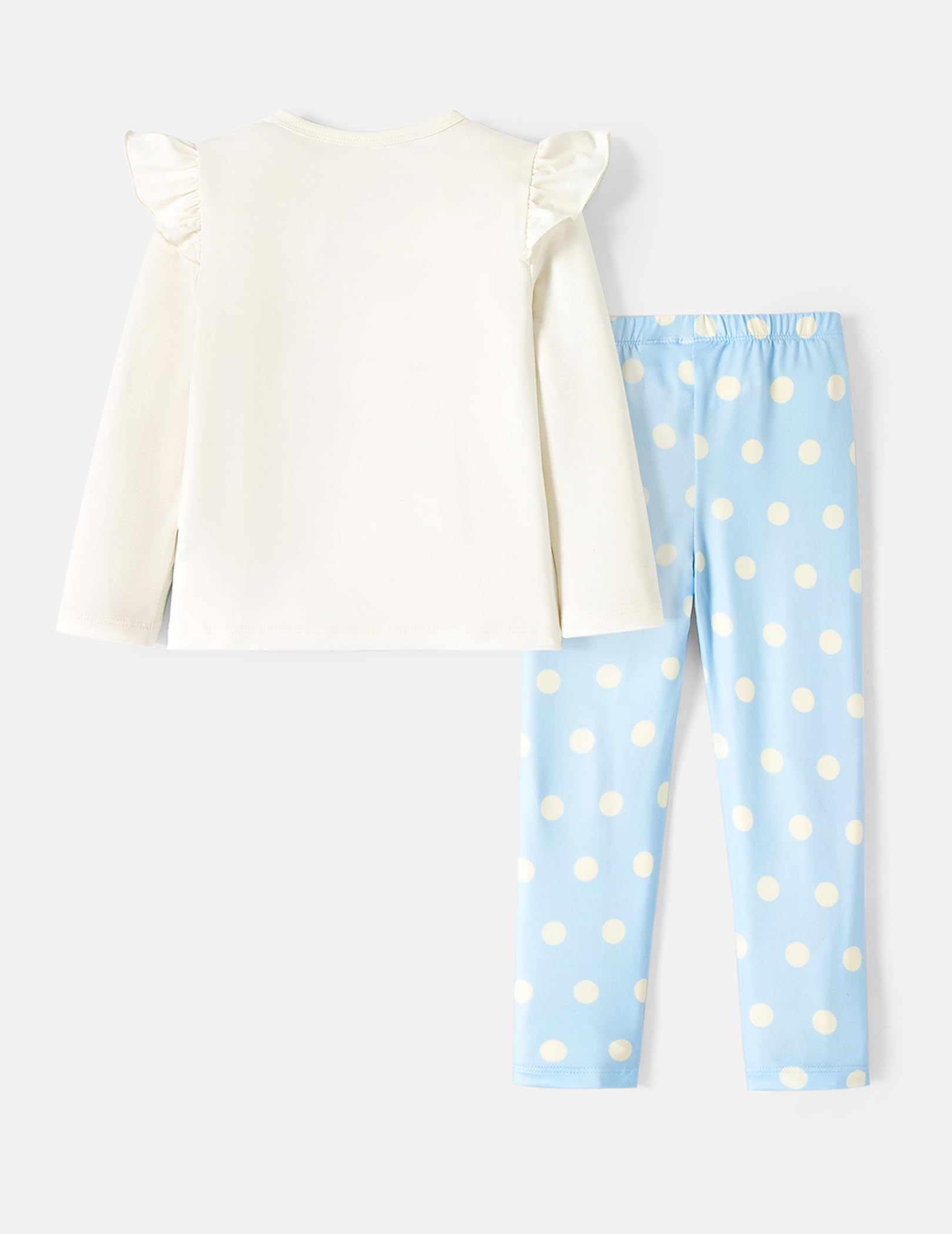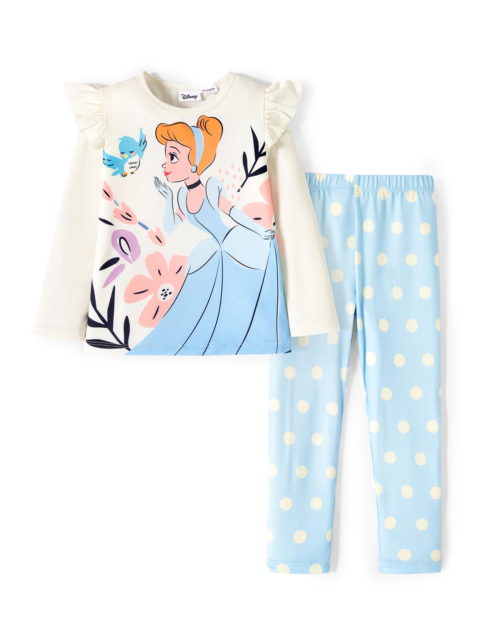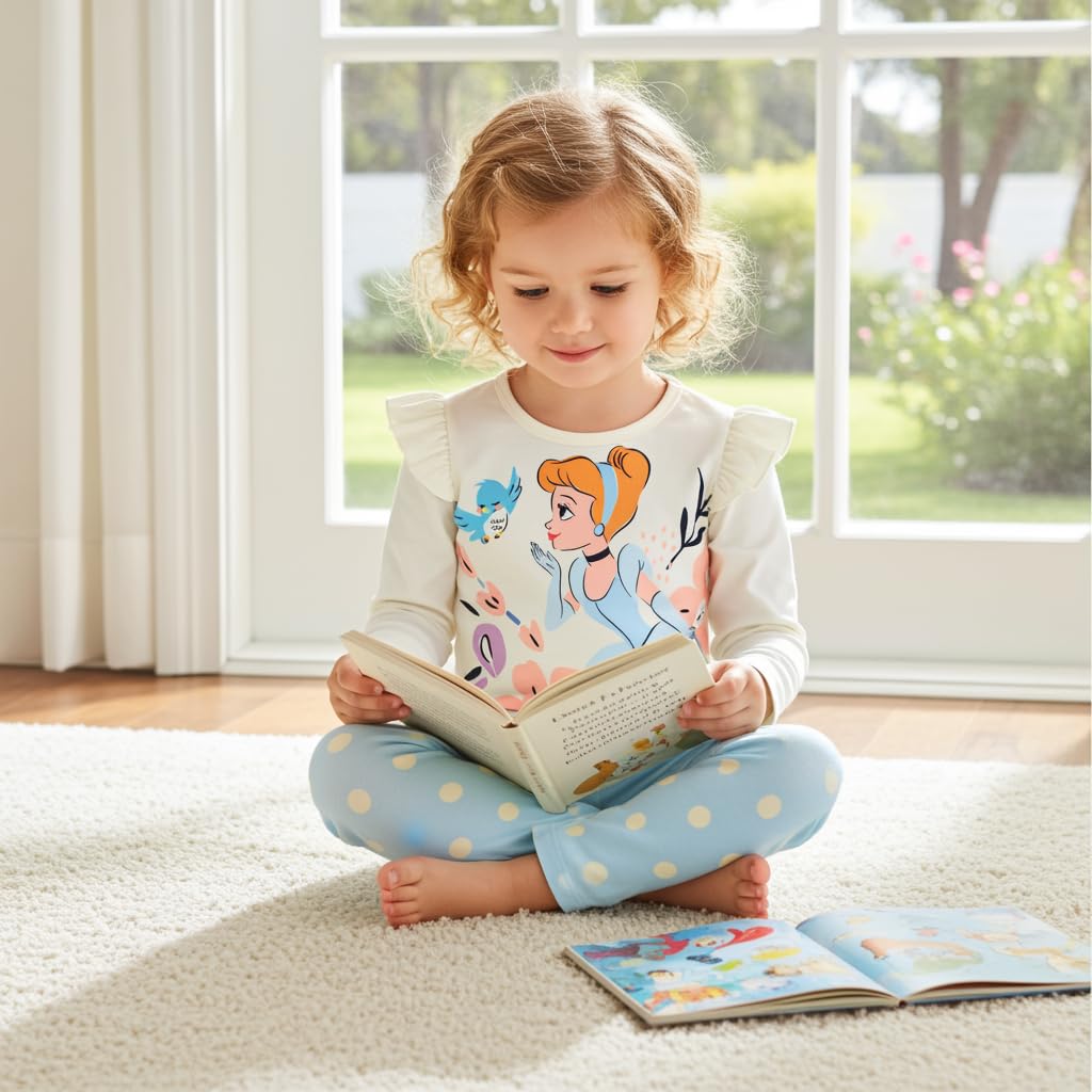 Charming & Whimsical Design: This Cinderella outfit for girls features delicate flutter sleeves and a sweet graphic of Cinderella with her bluebird friend, surrounded by soft floral accents. The long-sleeve crewneck top pairs with light blue leggings covered in cheerful white polka dots, creating a playful and coordinated look. Soft, comfortable, and easy to wear, this set is perfect for everyday fun and dress-up moments, and can be mixed with other tops, pullovers, or shirt sets
