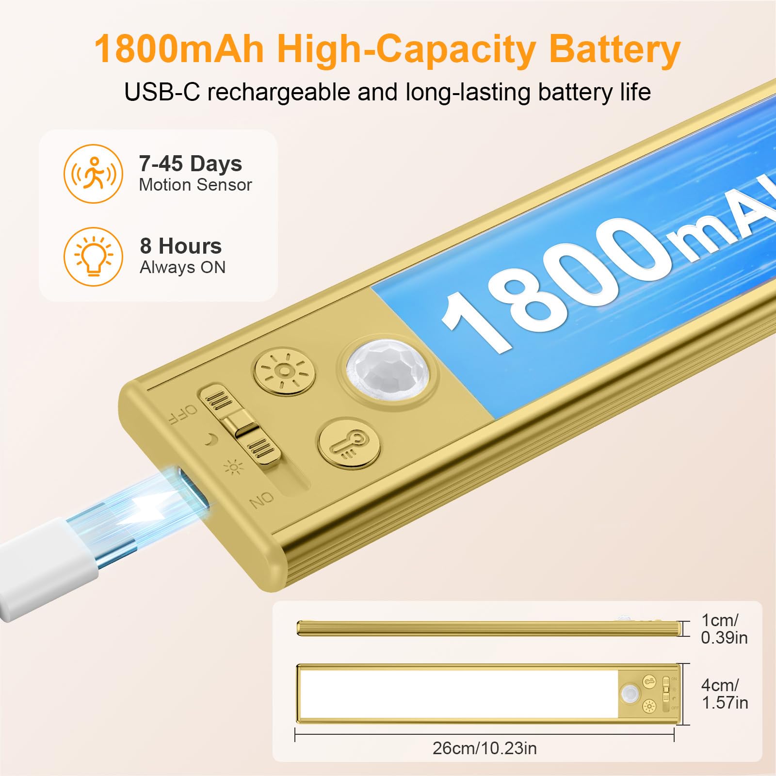 USB-C Rechargeable & Long-lasting: Built-in 1800mAh high-capacity battery, it offers up to 8 hrs in high brightness mode and lasts 45 days in sensor mode. It can be easily recharged by the type-C cable, no need to charge frenquently. It's the perfect choice for upgrading your home lighting! (2 USB-C cables included)