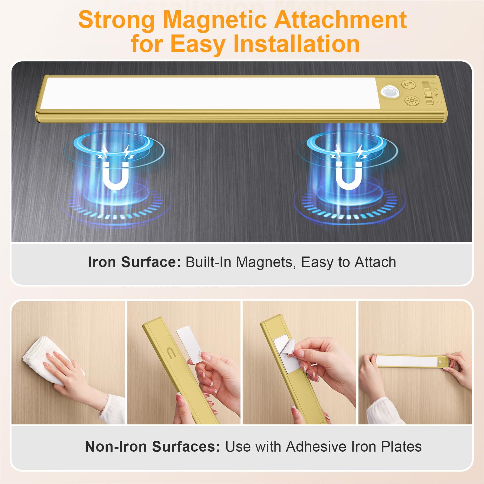 Ease of Installation & Wide Usage: With built-in strong magnets, these cabinet lights can be easily installed on iron surfaces. For non-metallic surface, you can use the included 6 adhesive iron plates to stick on anywhere you want, which means that it's easy to take off and put back on when it needs a charge. It is a good choice for various occasions including kitchen, bedroom, closet, cabinets, counter, pantry, basement, stair, hallway, shelves, etc.