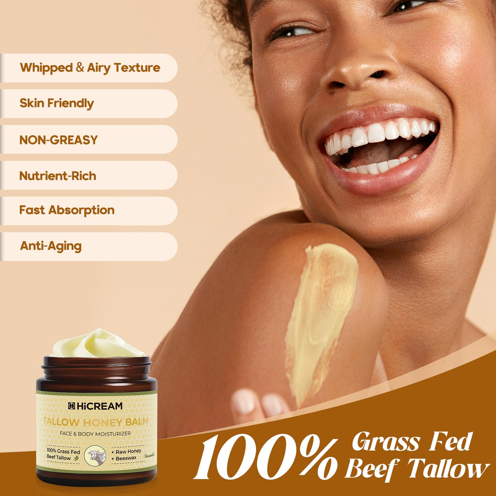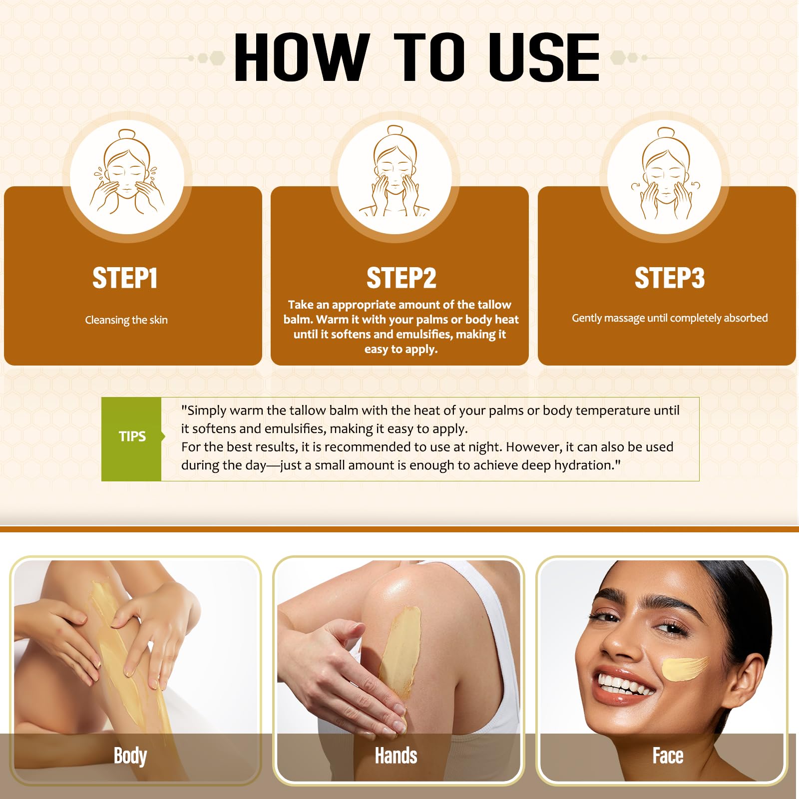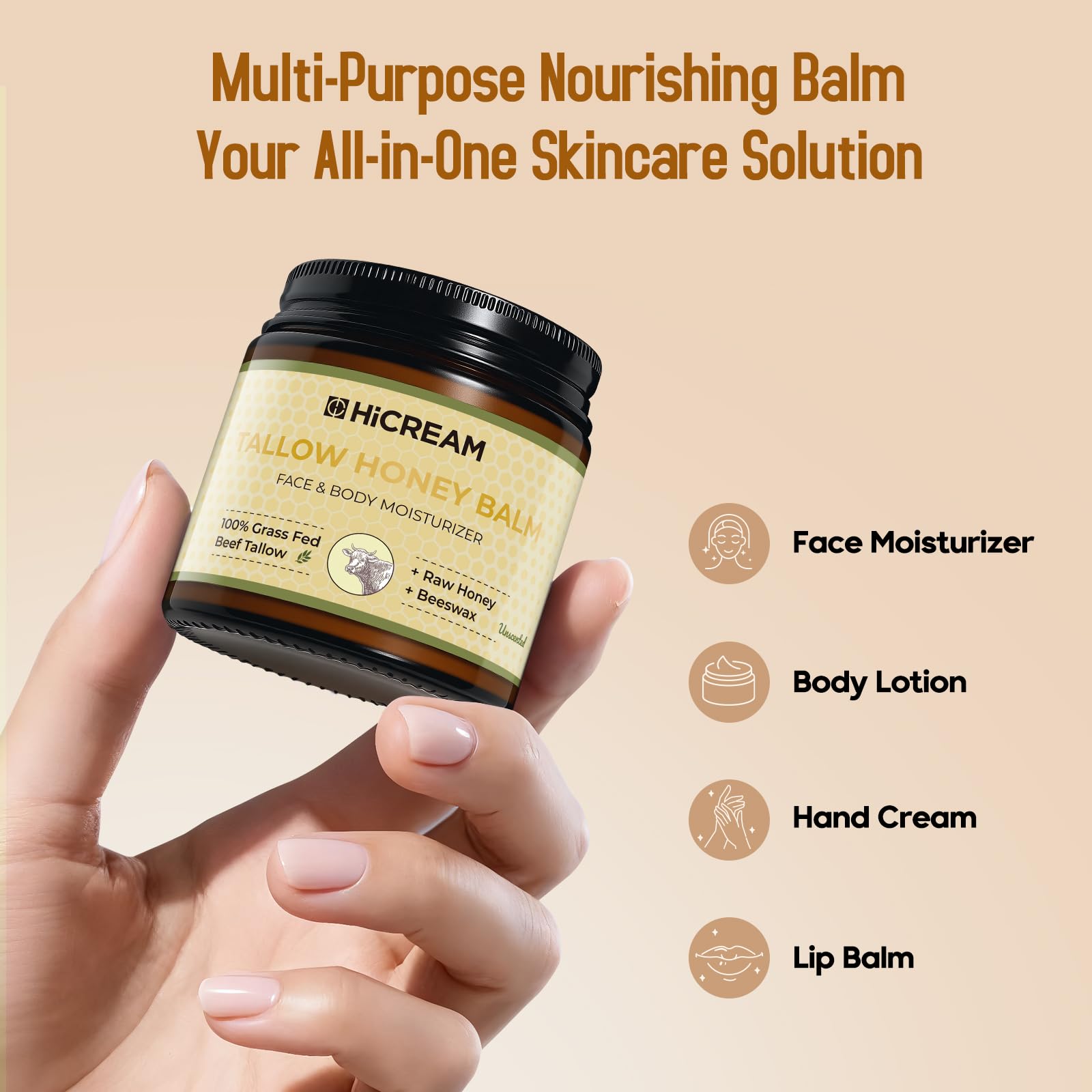 Directions for Use: After cleansing, scoop an appropriate amount of tallow and honey balm, warm between your palms or body heat until soft and emulsified, then gently massage onto face and body for deep hydration.